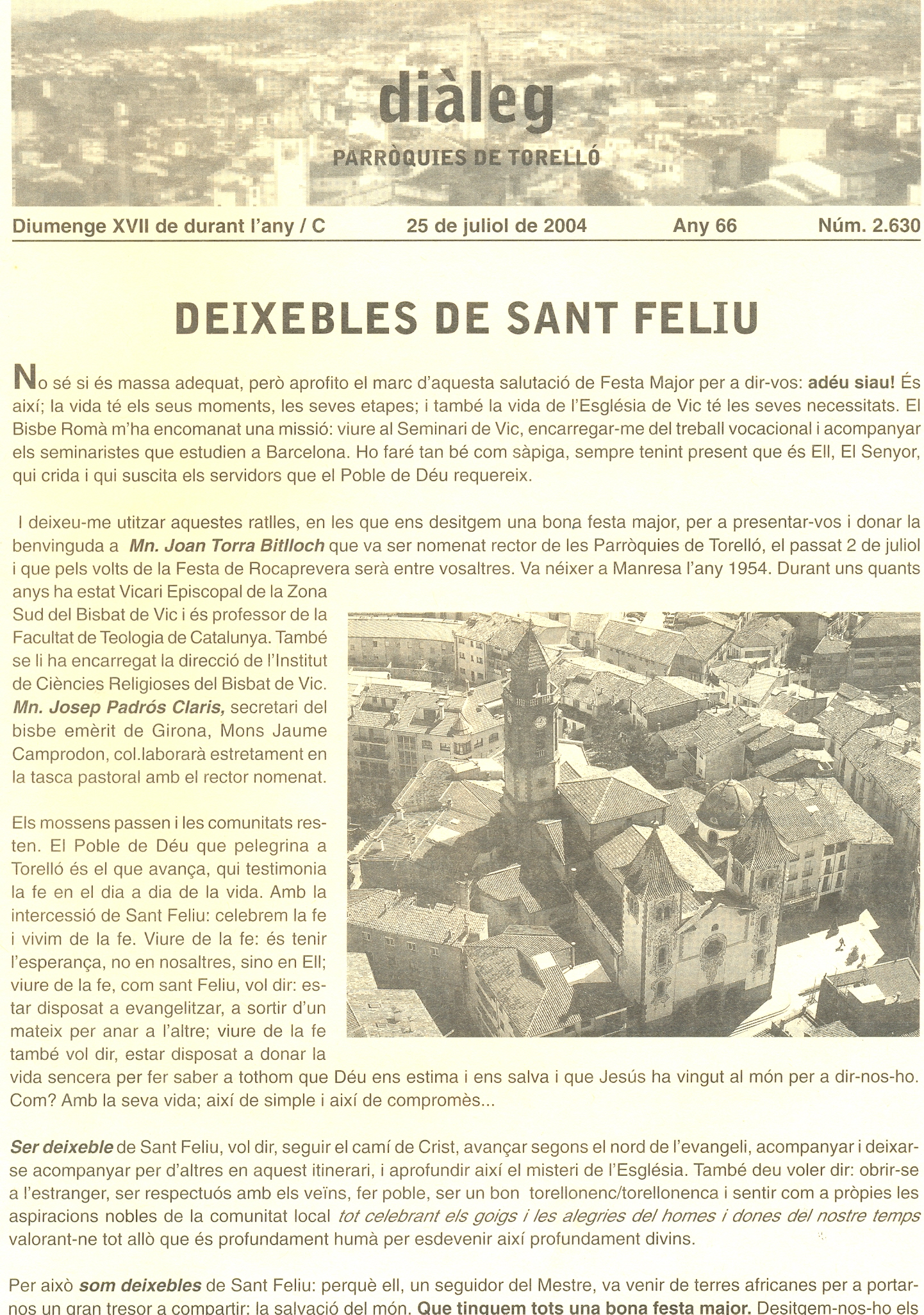 Si ens fixem bé en aquesta publicació parroquial, hi són ben presents els tres pilars fonamentals de l’Església: la difusió de la paraula de Déu, amb comentaris adients sobre les lectures de la festivitat, els sagraments, amb les intencions i els horaris de les misses, les catequesis preparatòries pels sagraments de la comunió i la confirmació, els batejos, el treball dels diferents grups de lectors i cors per donar més solemnitat a les celebracions i finalment l’activitat de Càritas, eina fonamental de l’Església per dur a terme la caritat,