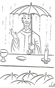 El 1973 (?) prenia el nom de “DIÀLEG” en català total. Un full doblat i quatre planes. En tenia cura mossèn Pere Casas, periodista i que treballà molt per les activitats de Torelló i del veïnat de Montserrat. Feia anys era de la Comissió d’Obres de Sant Feliu amb una colla formidable. De tant en tant, sigui per refer la façana esgrafiada, reparacions, la teulada… i per tant calia fer demandes extres per a recaptar diners. L’any 1969 es demanaren diners per solventar els molts degoters per tot arreu. L’amic Lluís Colell de la comissió presentà un dibuix: un capellà dient la Missa en paraigües. Tots els vam aprovar, però el senyor rector hi posà reserves i no es publicà. Era el 1969, irreverent? Auto-censura?
