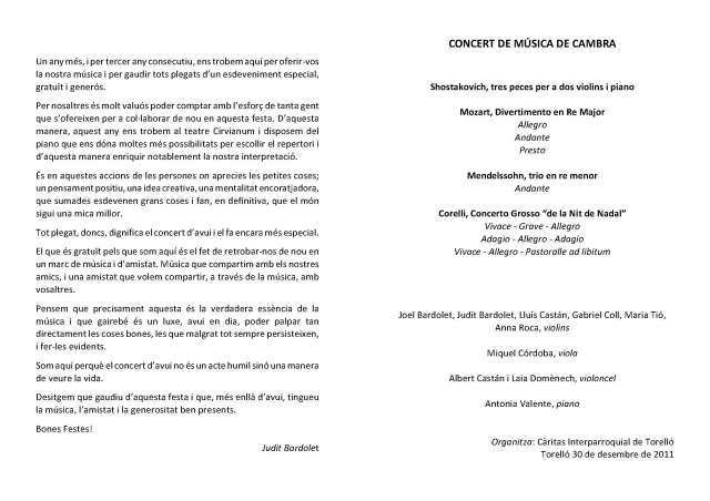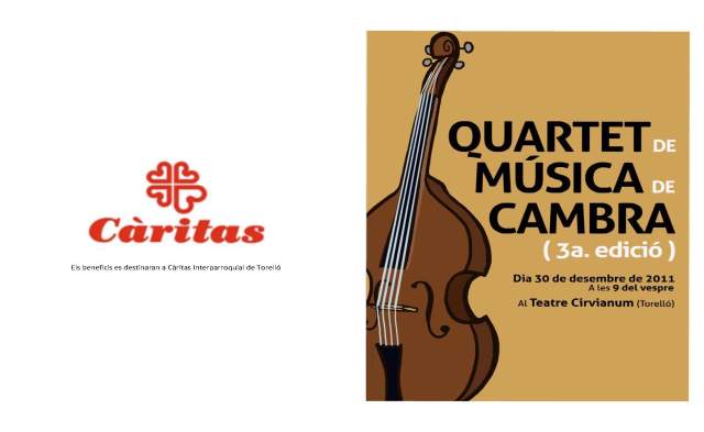 Divendres, dia 30 de desembre de 2011, a les 9 del vespre, al Teatre Cirvianum, hi ha un concert de Música de Cambra, els beneficis del qual aniran destinats a Càritas Interparroquial. És la tercera vegada que la Judit i el Joel Bardolet, amb una colla de companys, es brinden desinteressadament a fer un concert solidari. Aquest any, en fer-lo al Teatre Cirvianum, cedit gratuïtament, poden incorporar el piano en les seves interpretacions que ja sabem que són d’una gran qualitat. No us el perdeu!