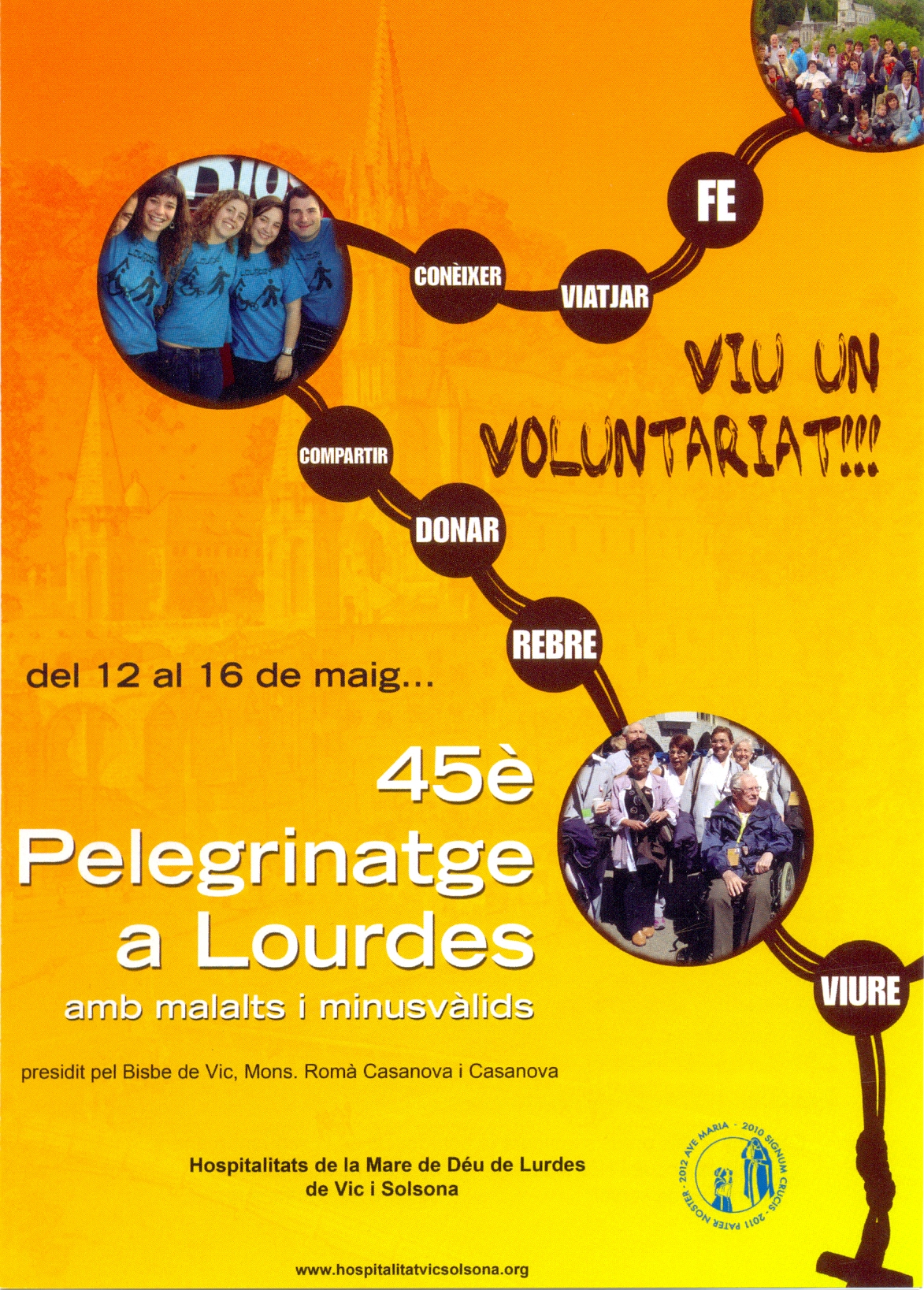 Així mateix per al Pelegrinatge calen voluntaris! L’eslògan d’aquest any hi convida: “Viu un voluntariat!!!” s’hi diu. Si creieu que ho podeu fer, demaneu més informació (938504150 o 938590743), o visiteu l’adreça: