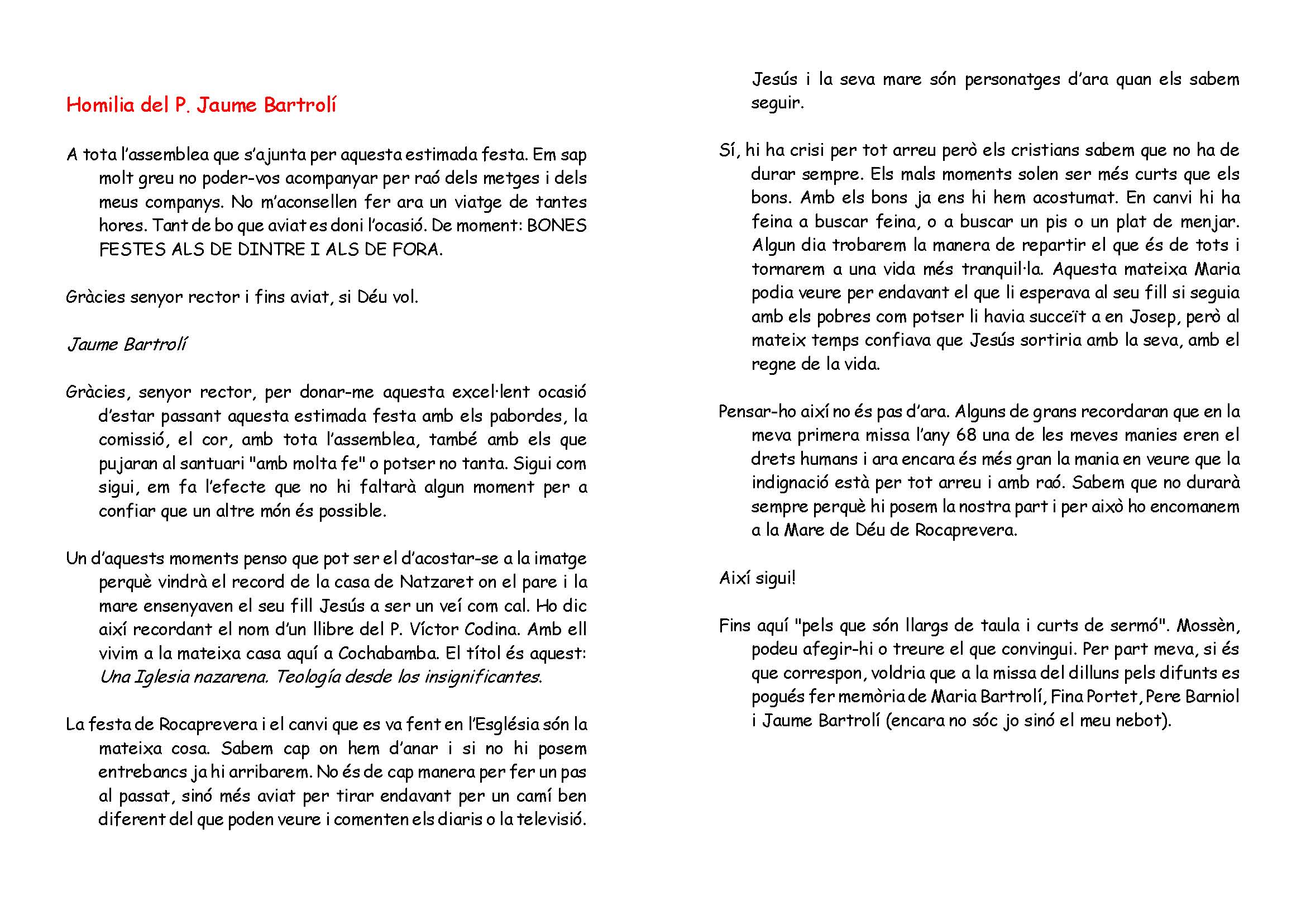 De totes maneres el P. Jaume Bartrolí va enviar el text d’allò que ell hauria dit si hagués pogut ser entre nosaltres. Aquestes són les paraules que van ser llegides en nom seu a l’hora de l’homilia. Ho teniu en pdf i en imatge.