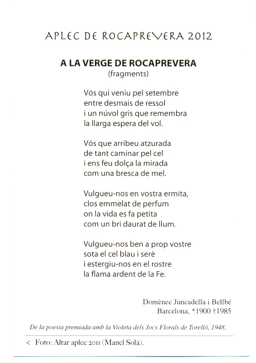 Com cada any el Santuari estava molt bellament ornat amb flors disposades per ressaltar la imatge de la Mare de Déu. La postal – estampa de record de l’Aplec d’aquest any, correspon a l’ornamentació floral de l’any passat, per a que tots ens tinguem un bell record. És aquesta, amb la corresponent poesia.