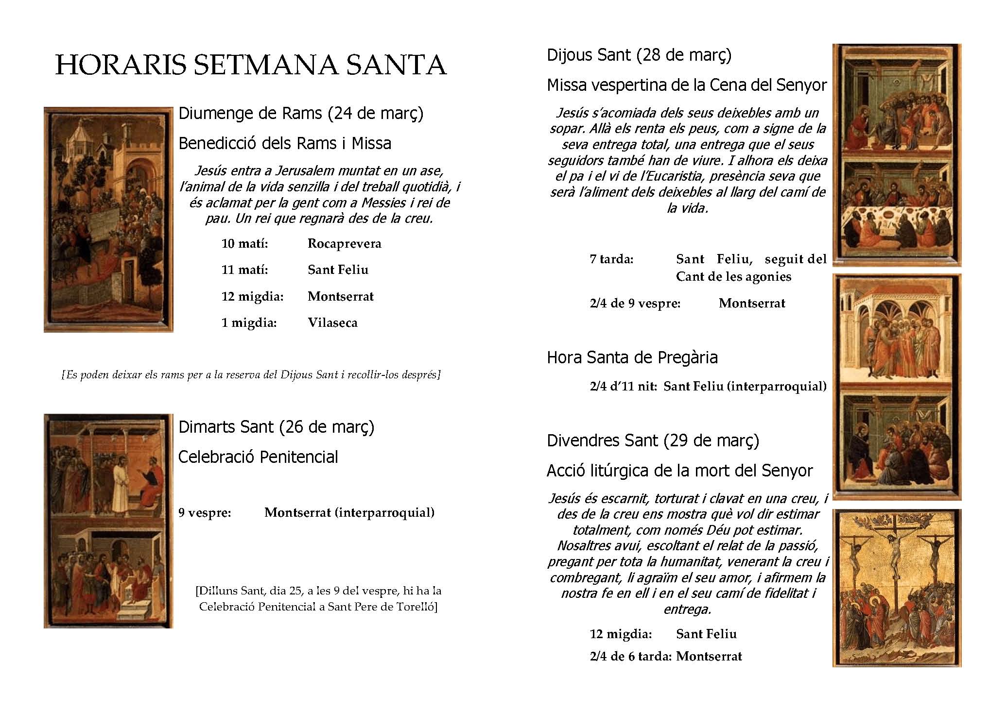 Aquí teniu els horaris de les celebracions de la Setmana Santa en pdf perquè us el pugueu descarregar, en imatge, i en format de text.