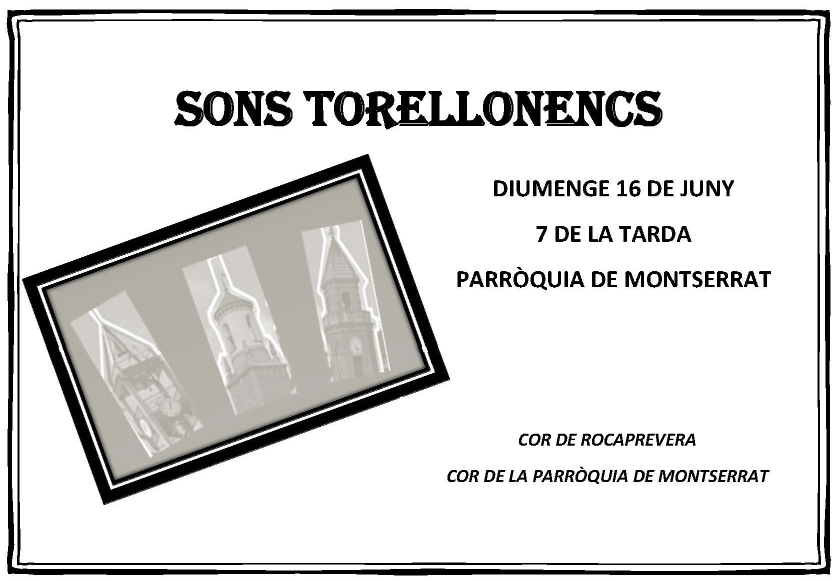 Diumenge, dia 16 de juny, a les 7 de la tarda, a l’església de la parròquia de Montserrat, amb el títol de “Sons torellonencs” hi ha un concert a càrrec del Cor de la parròquia de Montserrat i el Cor de Rocaprevera.