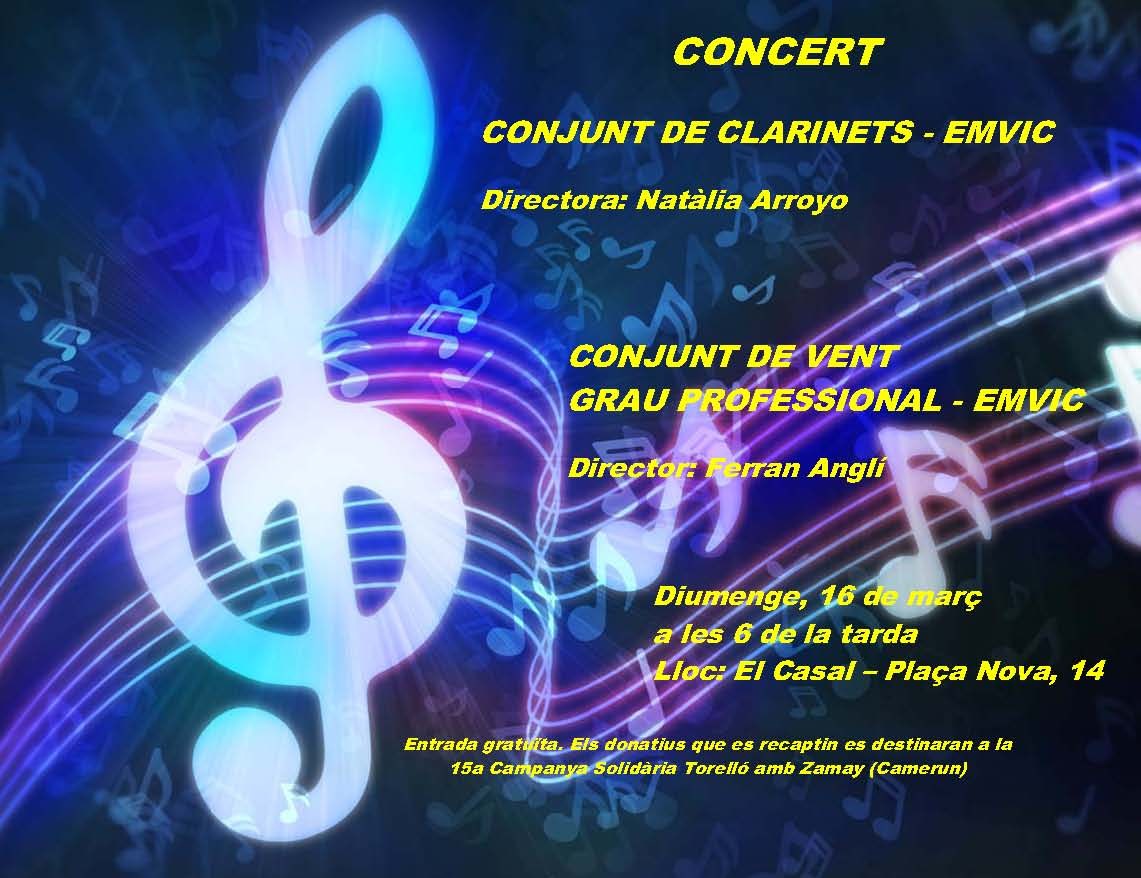 Aquest és el cartell anunciador del Concert d’instruments de vent, a càrrec del conjunt de clarinets de l’EMVIC, dirigits per Natàlia Arroyo i el conjunt de vent, dirigit per Ferran Anglí, i els beneficis del qual aniran destinats a la Campanya Solidària.