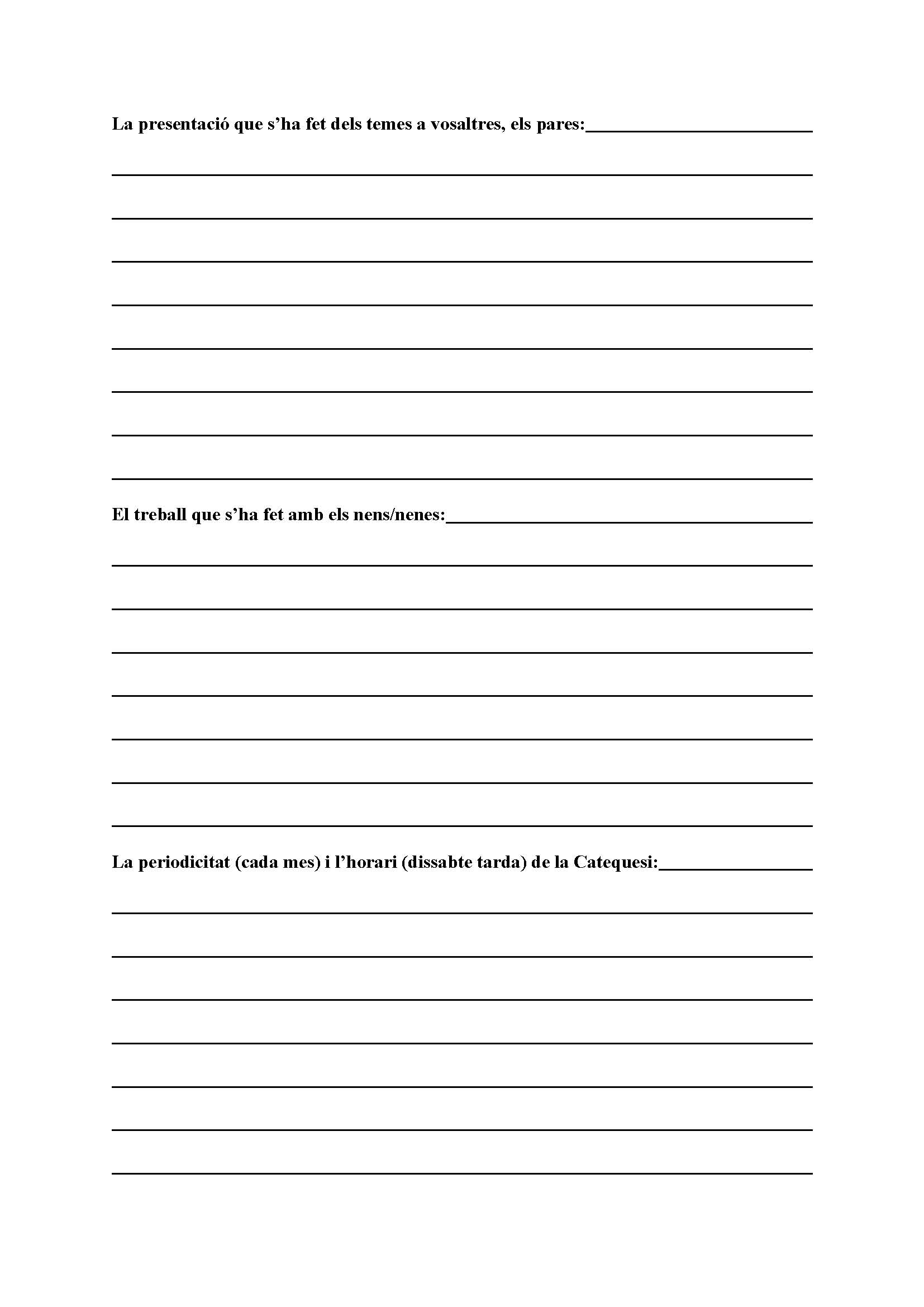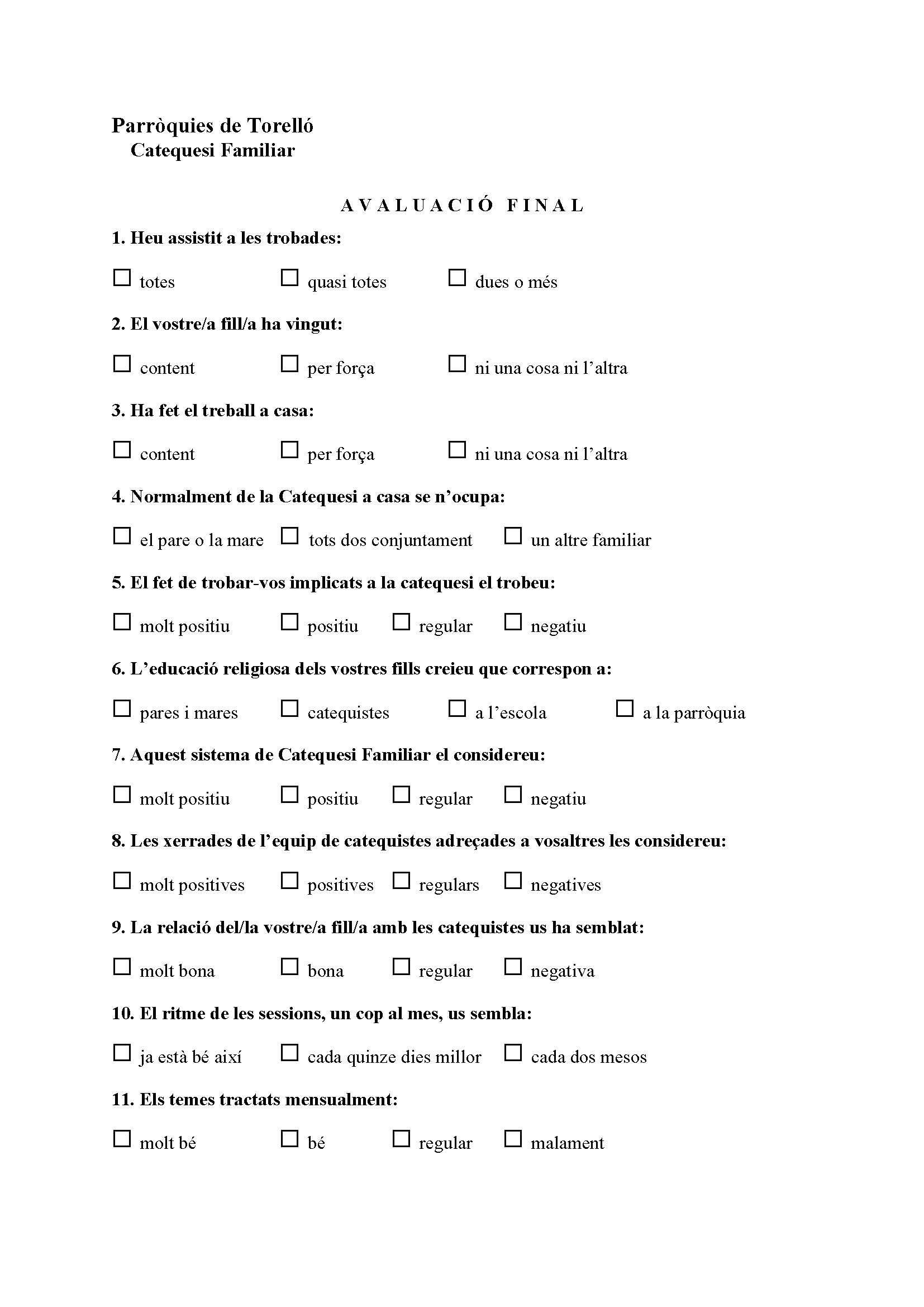 En la trobada de la catequesi Familiar del mes de Maig ja és tradicional que amb el grup de pares fem una revisió de com ha anat el curs per veure quines coses sembla que podrien anar millor. Es passa un material escrit perquè es contesti de maner anònima. És aquest que posem tot seguit en imatge i en format pdf per si algú que no hi va poder ser el vol descarregar i ho vol fer arribar.