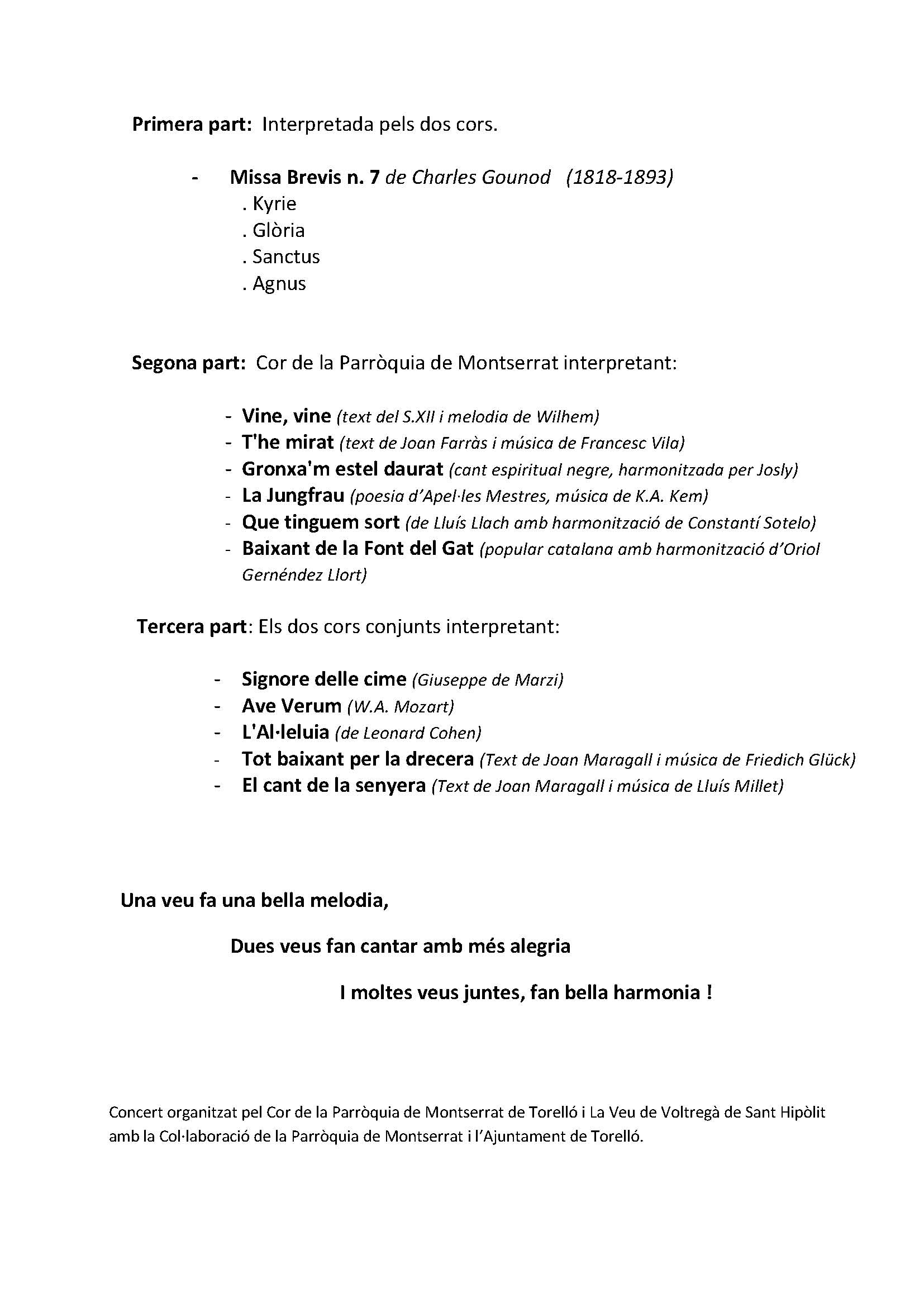 Cada any el Cor de la parròquia de Montserrat organitza un concert per Sant Jordi. Aquest any va ser el diumenge, dia 4 de maig, a la mateixa església parroquial. Va ser de molta categoria. Hi van intervenir, a més del Cor de la parròquia, la Coral La Veu de Voltregà i en el programa hi figurava la Missa de Gounod. Aquí teniu el programa en pdf i en imatge.