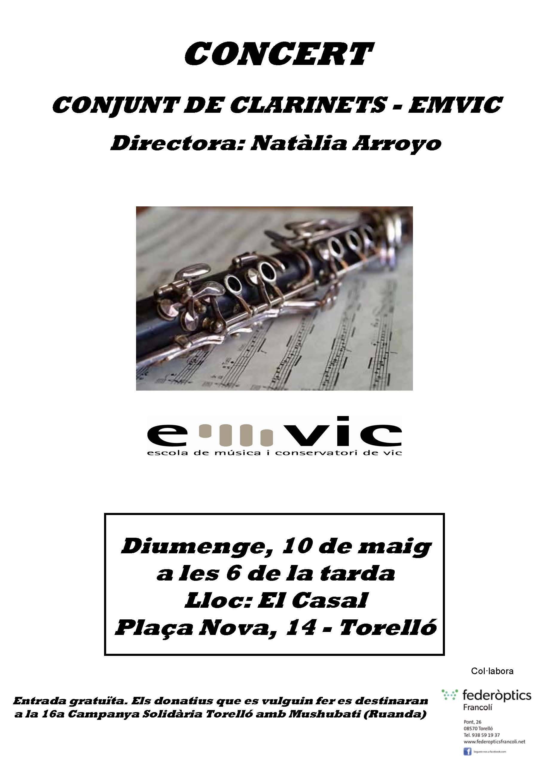 Serà el diumenge, dia 10 de maig del 2015, al teatre del Casal, de la Plaça Nova, a les 6 de la tarda, a càrrec del conjunt de clarinets de l’EMVIC, dirigits per Natàlia Arroyo.
