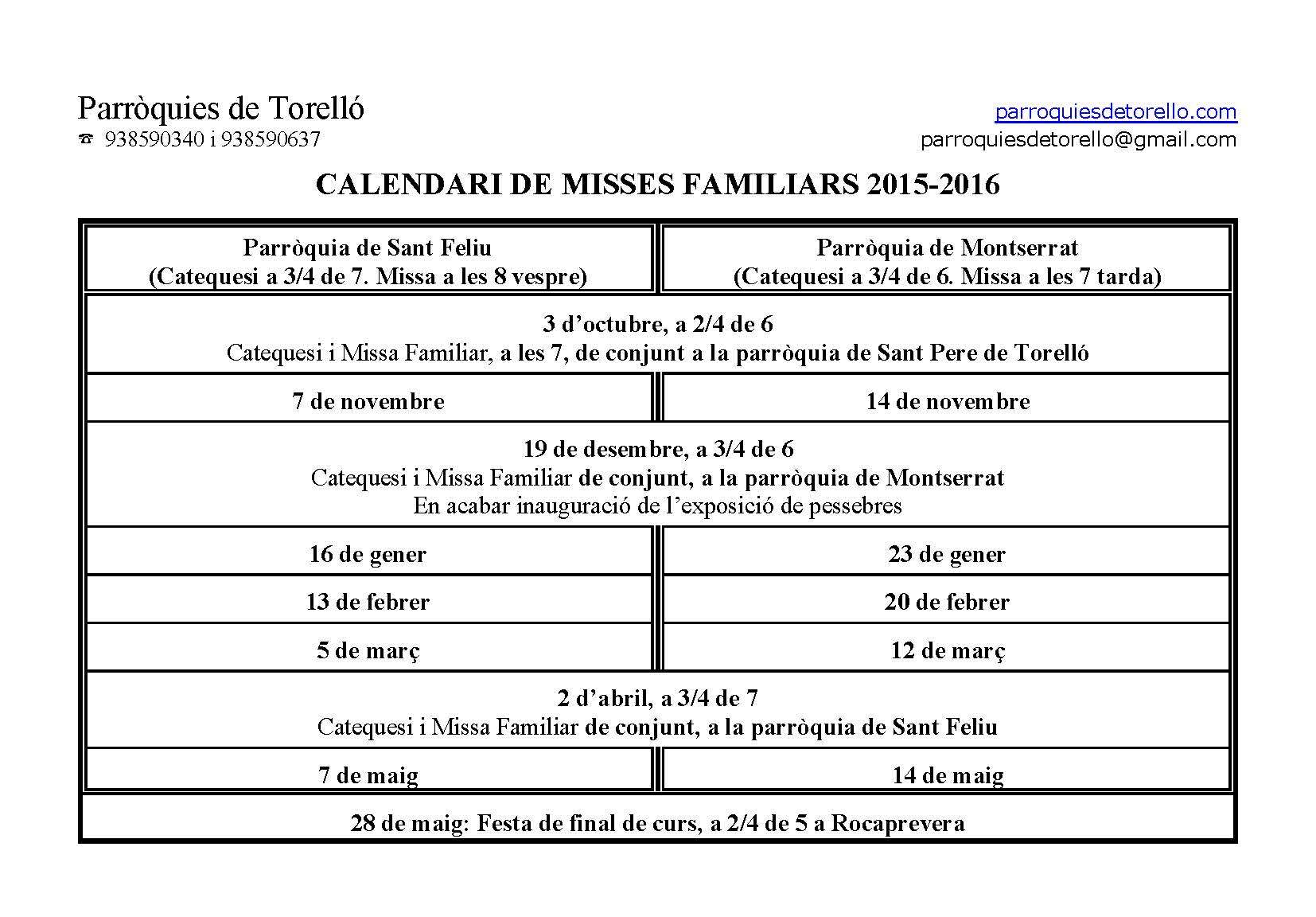 Aquest és el calendari de les Misses Familiars per al curs 2015-16
