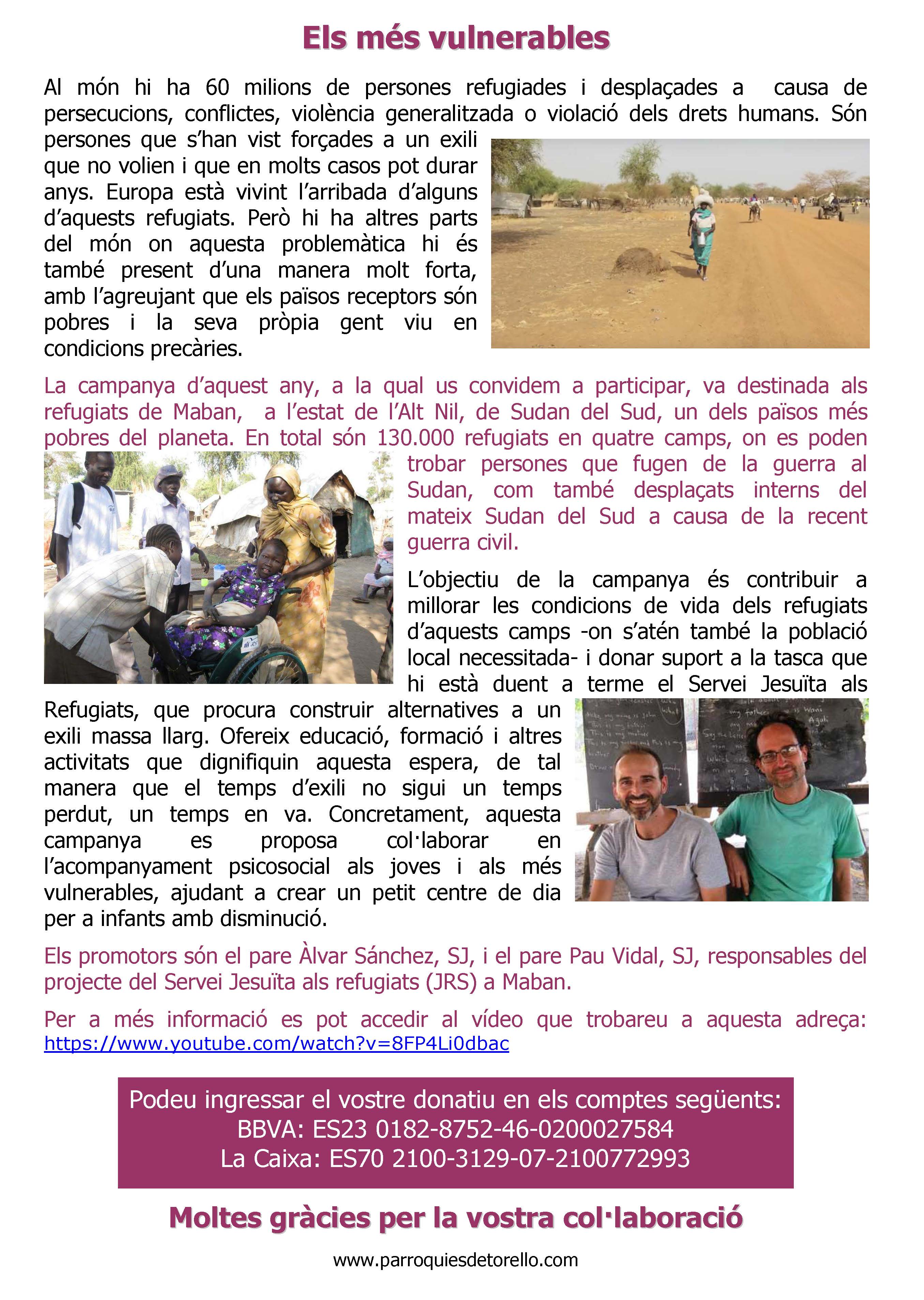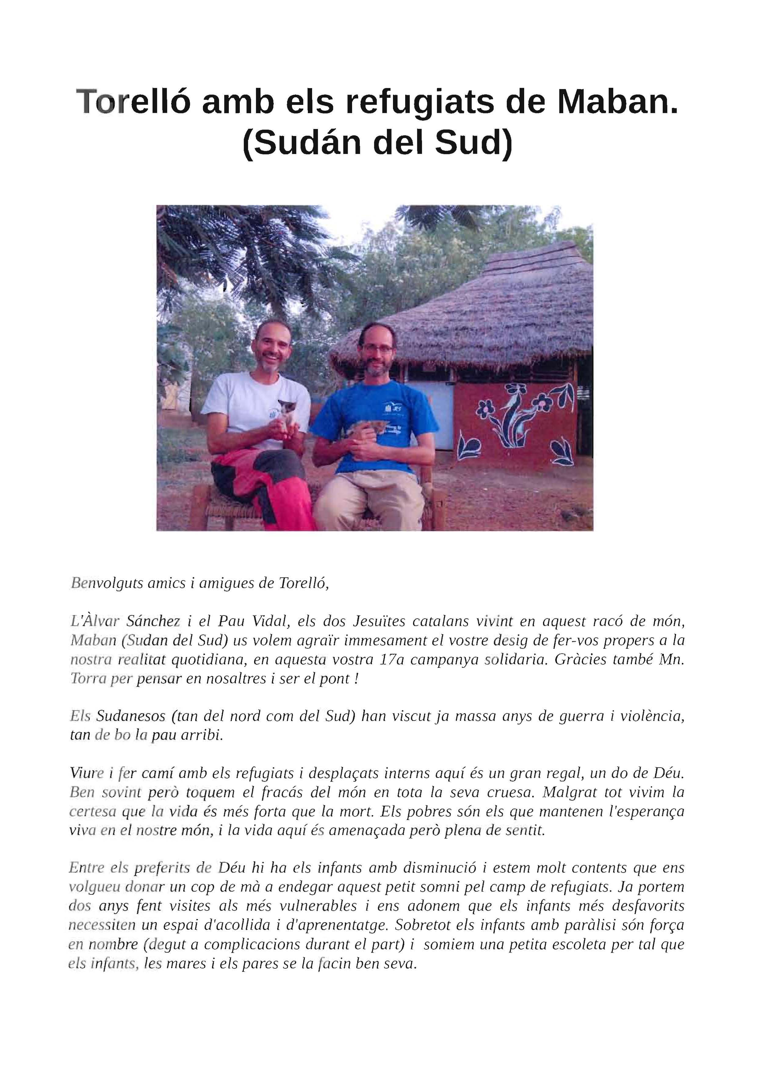 Va ser el dissabte, dia 30 de gener de 2016, a les 9 del vespre, al Casal de Sant Feliu. I va ser un acte molt profitós. Es va presentar la 17ª Campanya Solidària “Torelló amb els refugiats de Maban (Sudan del Sud)”. Santi Torres, director adjunt de Cristianisme i Justícia i company del Pau Vidal i l’Àlvar Sánchez, els jesuïtes que estan treballant a Maban i als quals destinarem el fruit de la Campanya, va ser qui ens va fer aquesta presentació, molt pedagògica i ben documentada.