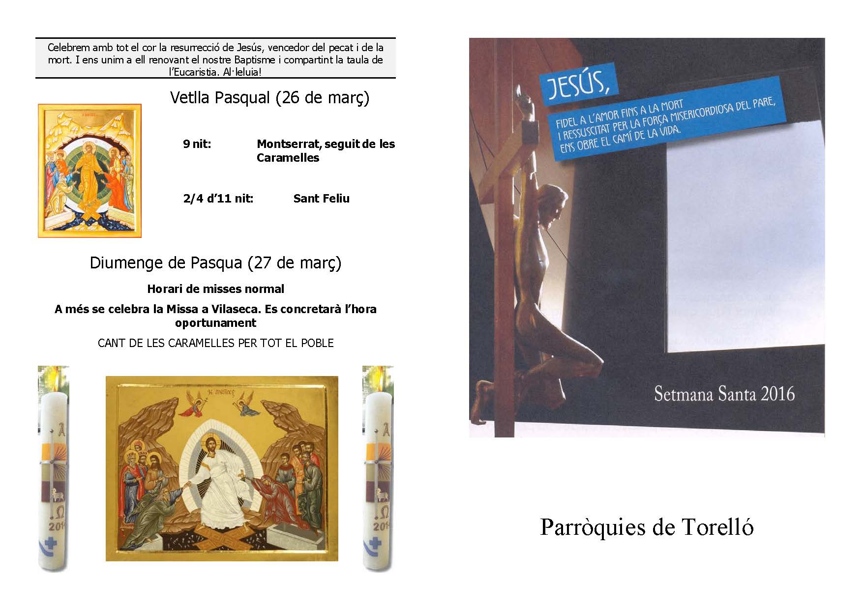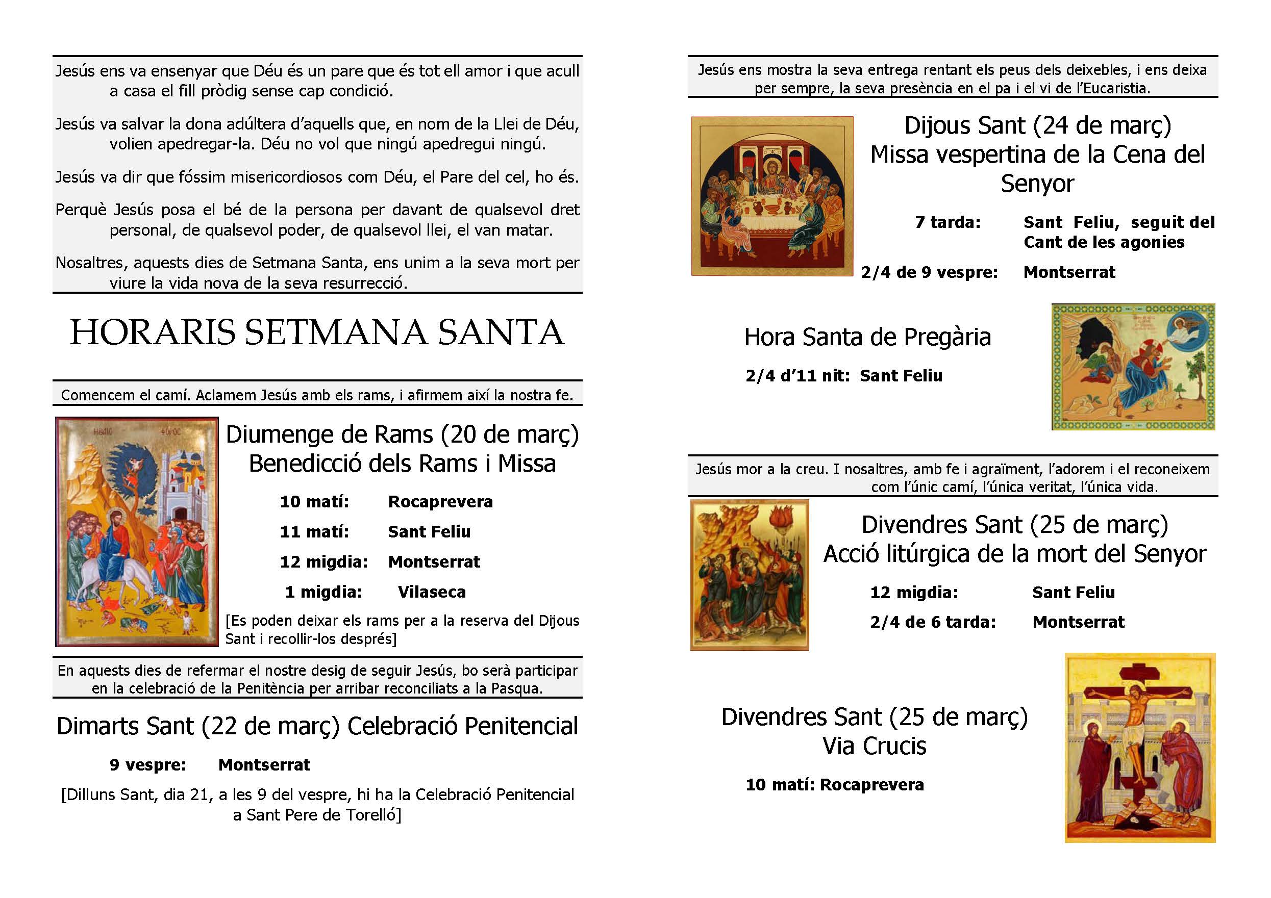 Aquí teniu els horaris de les celebracions de la Setmana Santa en pdf perquè us el pugueu descarregar, en imatge, i en format de text.