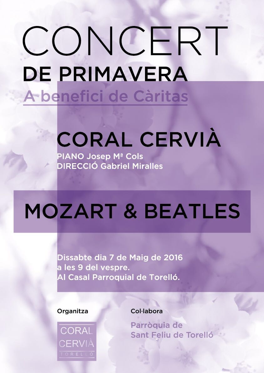Ha estat el dissabte, dia 7 de maig del 2016, al Teatre del Casal parroquial de Sant Feliu de la Plaça Nova. Un concert fins a cert punt “sorprenent” pel títol amb que hi convidava: Mozart & Beatles. Aquest era el cartell anunciador: