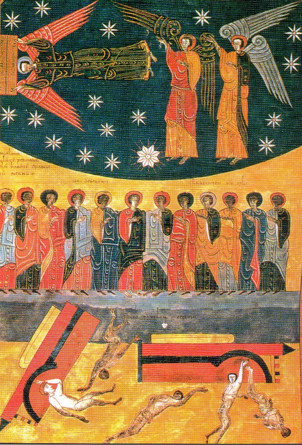 - Dels tres àngels, el primer està volant per l’espai i porta la Bona Nova, l’Evangeli arreu.