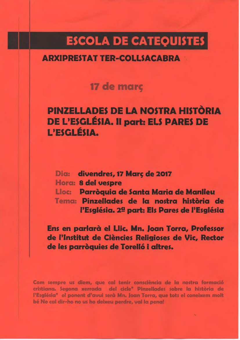 Per divendres, dia 17 de mafrç, l’escola de Catequistes de l’Arxiprestat Ter-Collsacabra, convoca una trobada de formació a Manlleu, amb el títol: “Pinzellades de la nostra història de l’Església. II part: Els Pares de l’Església”.