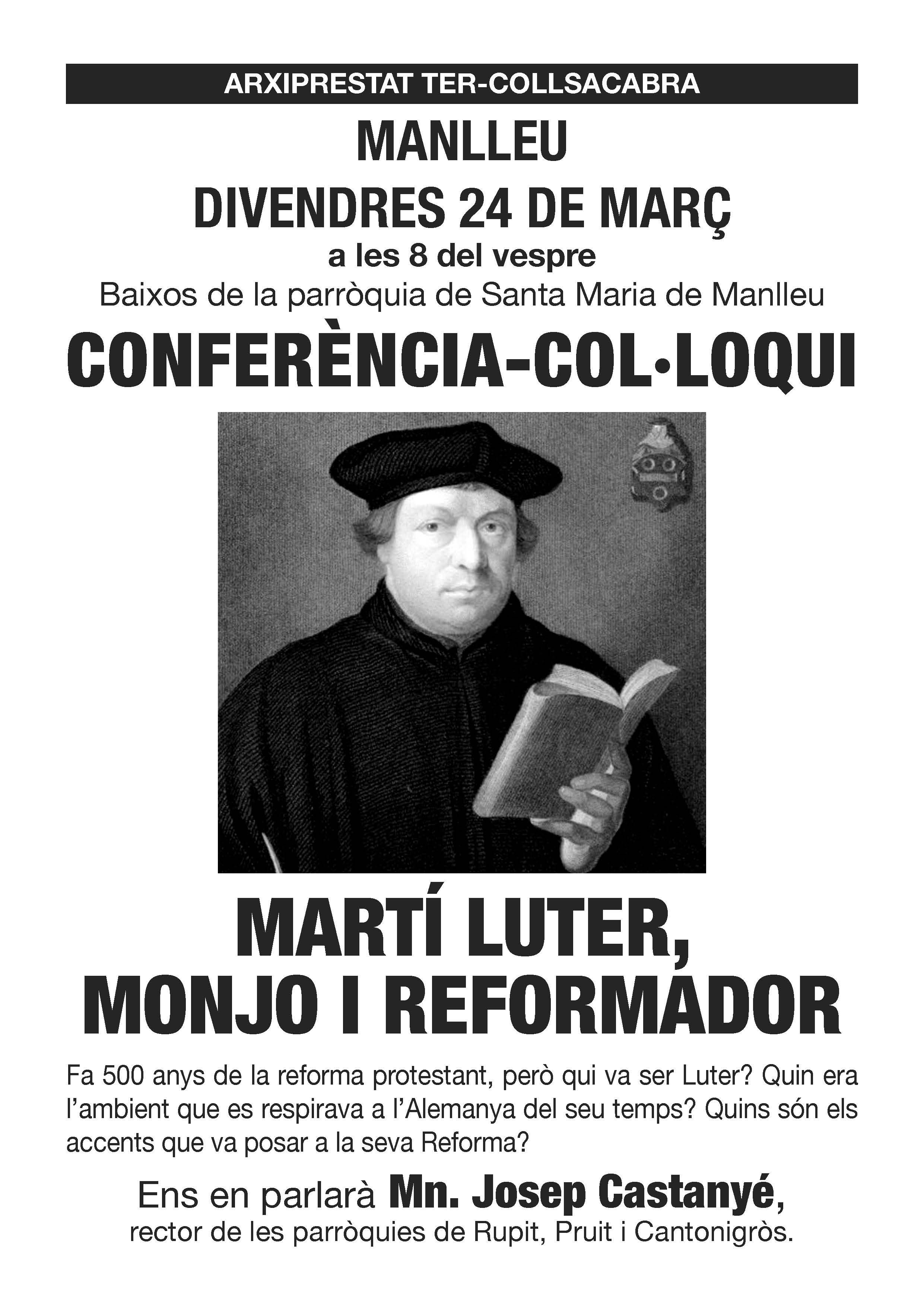 Es fa el divendres dia 24 de març a Santa Maria de Manlleu, a les 8 del vespre. La fa mn. Josep Castanyé i el temes és: “Martí Luter, monjo i reformador”. Aprofitem-ho que val la pena!