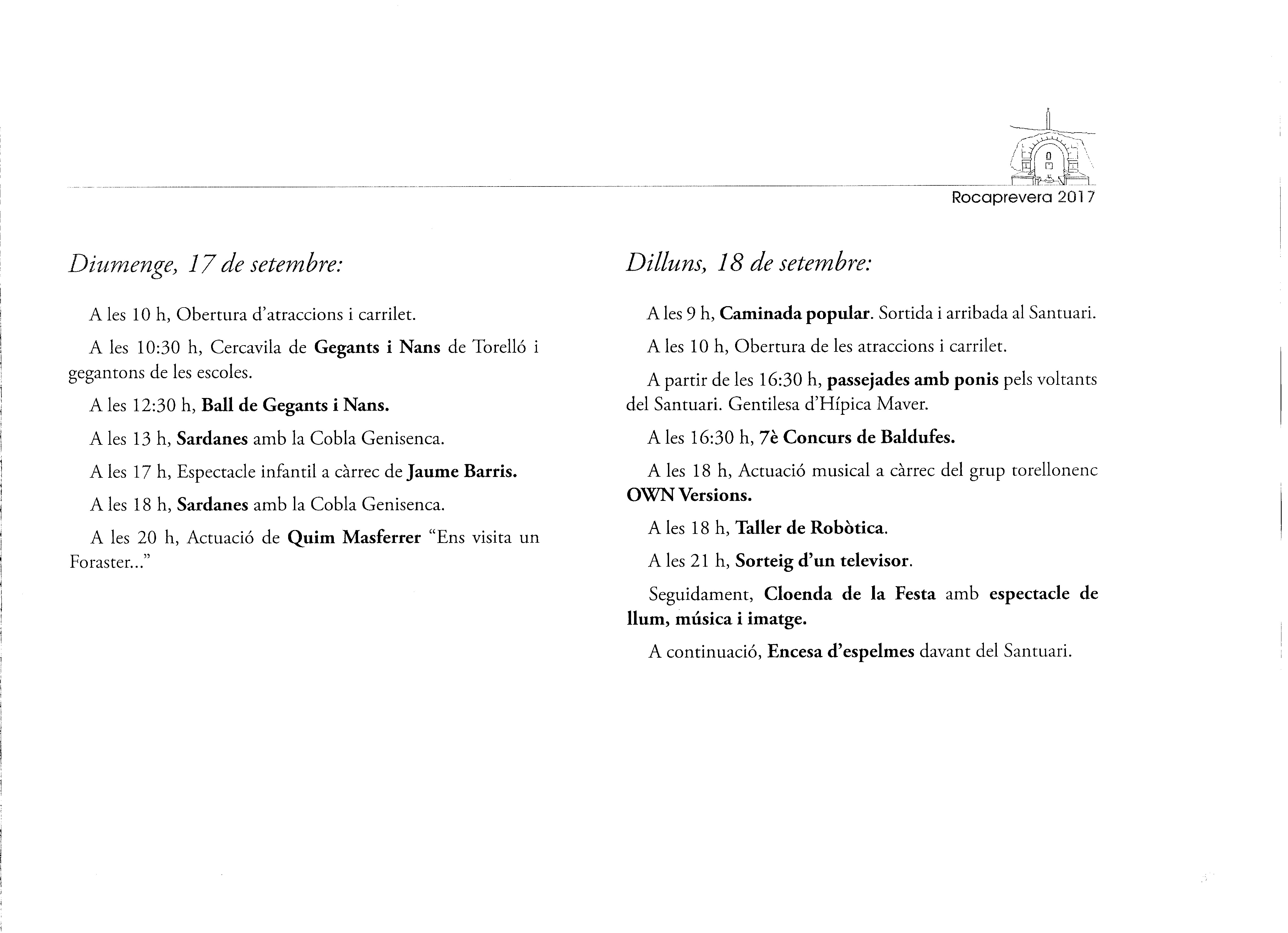 - Diumenge dia 17 de setembre: A les 11, solemne MISSA CONCELEBRADA. Presidirà i farà l’homilia Mn. Josep Castanyé Subirana, rector, entre d’altres, de les parròquies de Cantonigròs, Pruit, Rupit…, i professor emèrit de la Facultat de Teologia de Catalunya.
