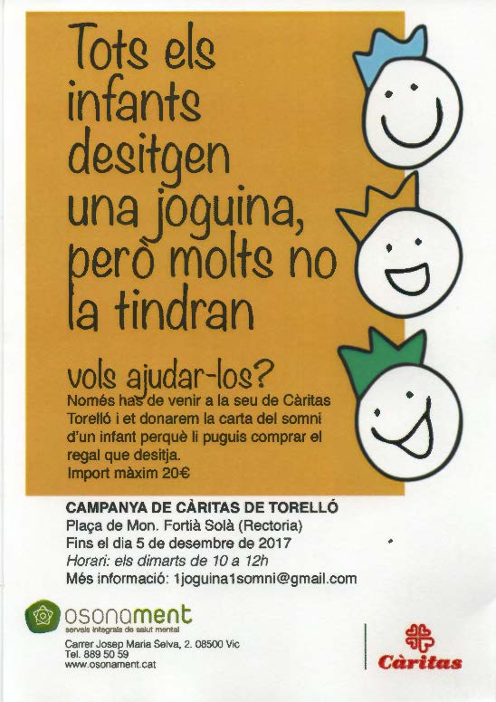 Amb la Campanya de Nadal d’aquest any 2017 i primers del 2018 hi torna a entrar el programa de joguines de Càritas interparroquial, que ja sabeu que de fet funciona durant tot l’any i que treballa de conjunt amb Osonament.