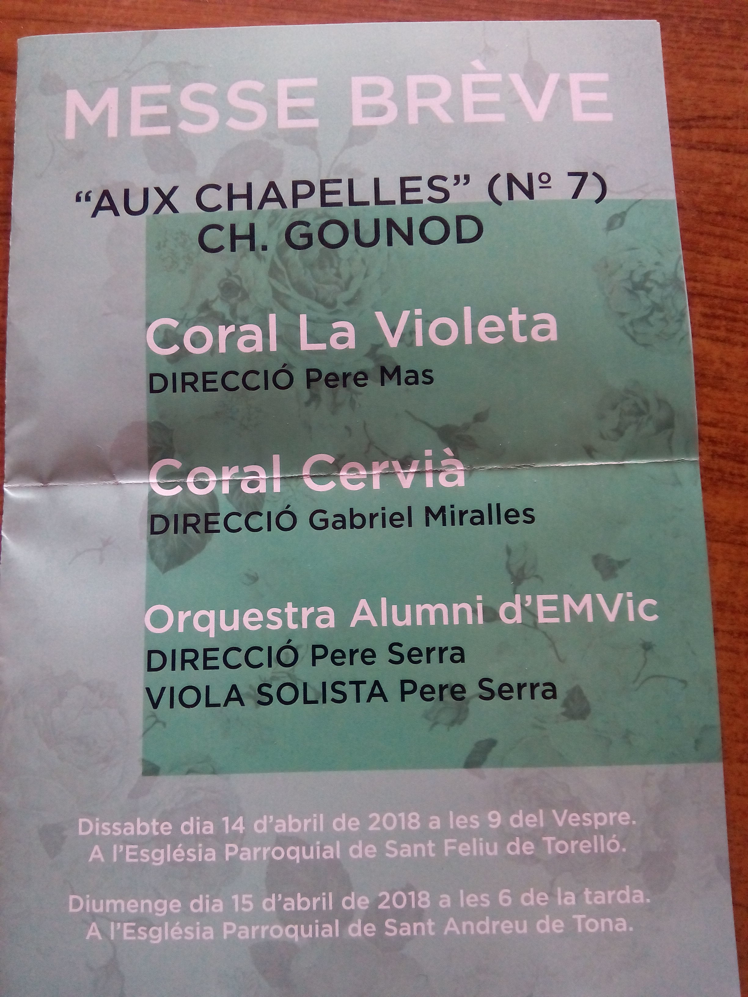 Ha estat el dissabte, dia 14 d’abril del 2018, a l’església parroquial de Sant Feliu. Un concert en intercanvi amb la Coral La Violeta, sota la direcció de Pere Mas, i amb l’orquestra Alumni d’EMVic amb direcció de Pere Serra.