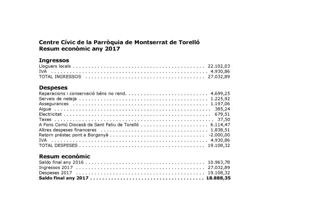 Aquest és l’estat de comptes del Centre Cívic de la parròquia de Montserrat a 31 de desembre de 2017.