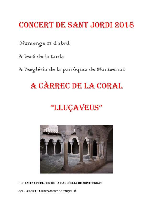 Cada any el Cor de la parròquia de Montserrat organitza un concert per Sant Jordi. Aquest any va ser el diumenge, dia 22 d’abril, a la mateixa església parroquial, a les 6 de la tarda. Va ser un concert captivador, d’una molt bona qualitat musical. Va ser a càrrec de la coral “Lluçaveus”, que finalment va comptar amb la direcció de Bruno Nájera ja que la seva titular l’Anna Gorchs acabava de tenir un fill -a qui els cantaires van dedicar el concert- i la que l’havia de suplir, la Roser Reixach, que figurava en el programa, tampoc no hi va poder ser.