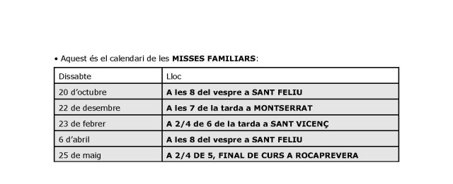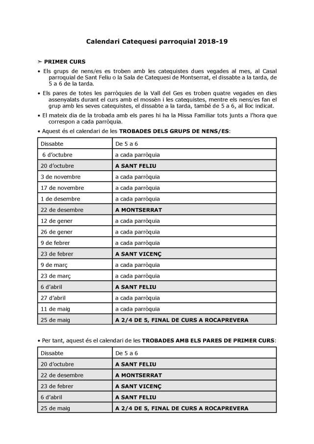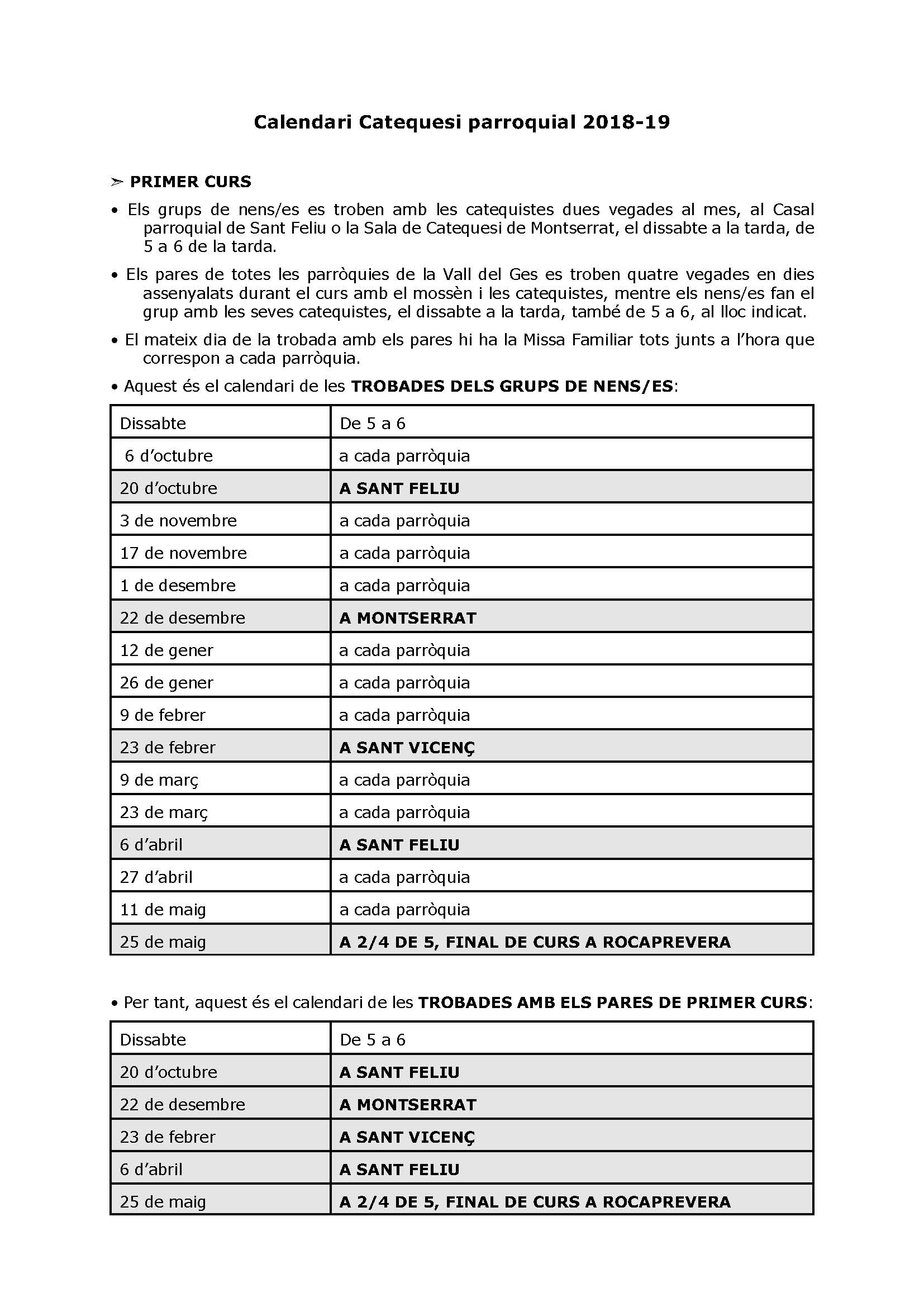 Després de les inscripcions i d’haver fet les reunions de pares, aquest és el calendari definitiu del Primer curs de la Catequesi parroquial per al curs 2018-19.