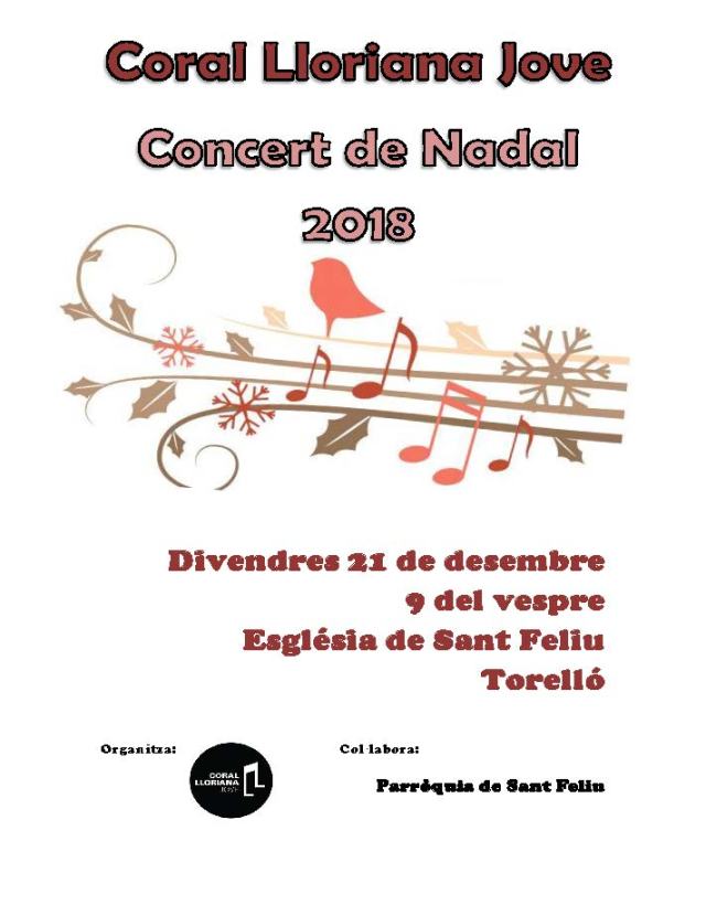 El divendres, dia 21 de desembre del 2018, totes les seccions de la coral Lloriana Jove van cantar a l’església de Sant Feliu, és a dir, la secció petita, mitjana i gran, per separat i totes juntes. Ho van fer amb direcció d’Eva Mayo i de Judit Lòpez i acompanyment al piano del Joan Borràs. Aquest era el cartell que l’anunciava: