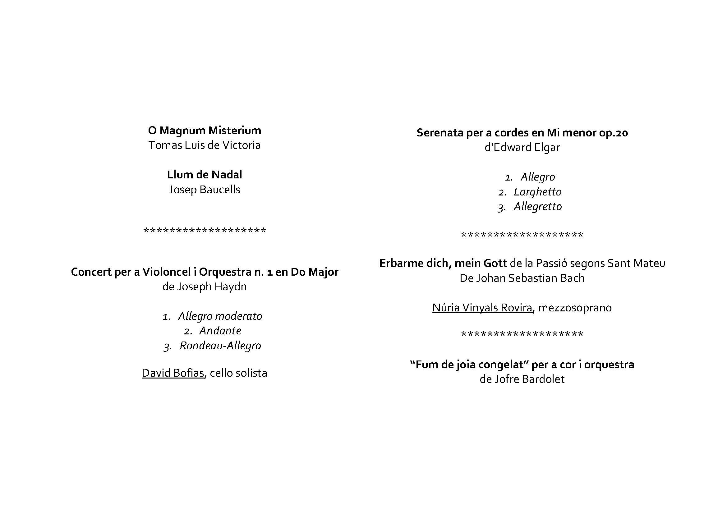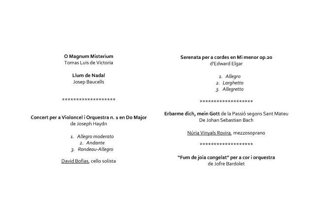 Es van anar succeient obres de Tomas Luis de Victoria, Josep Baucells, Joseph Haydn, Edward Elgar, Johan Sebastian Bach, i el mateix Jofre Bardolet.