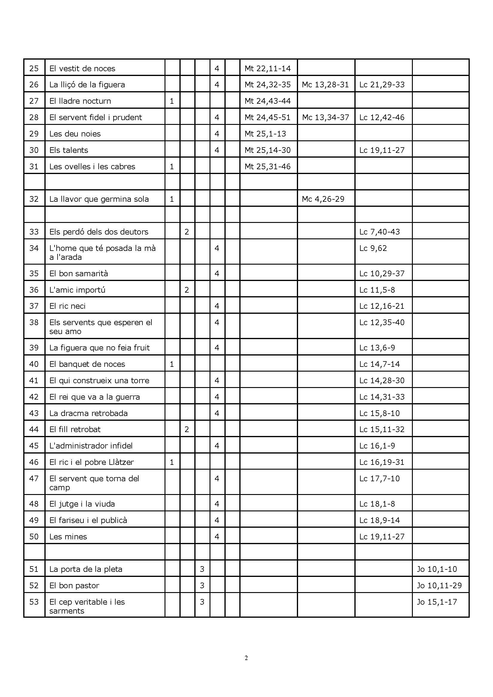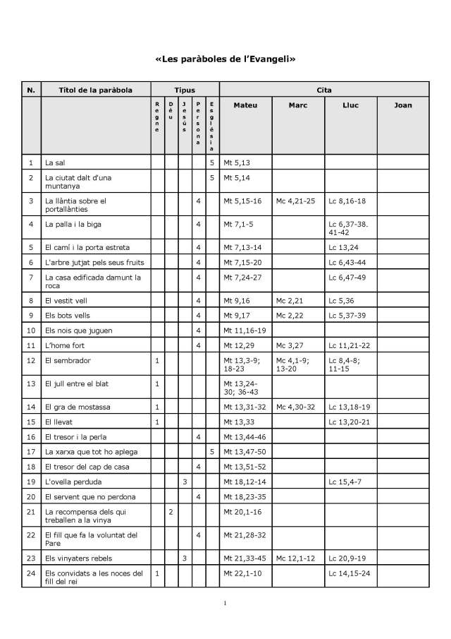 En el guió ja hi havia un quadre amb la llista i classificació de totes les paràboles explicades per Jesús en els evangelis. És aquest quadre:
