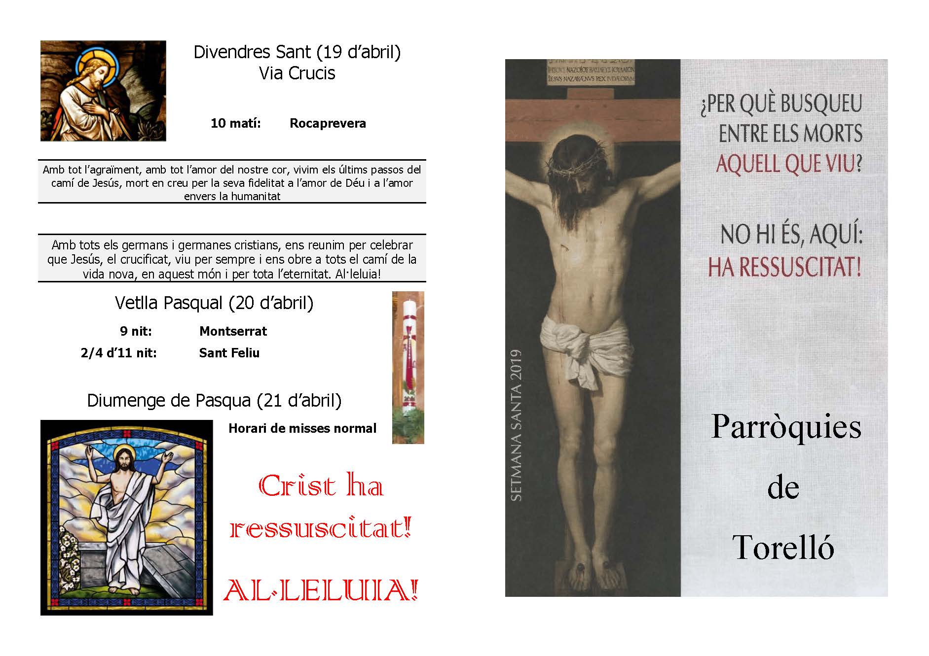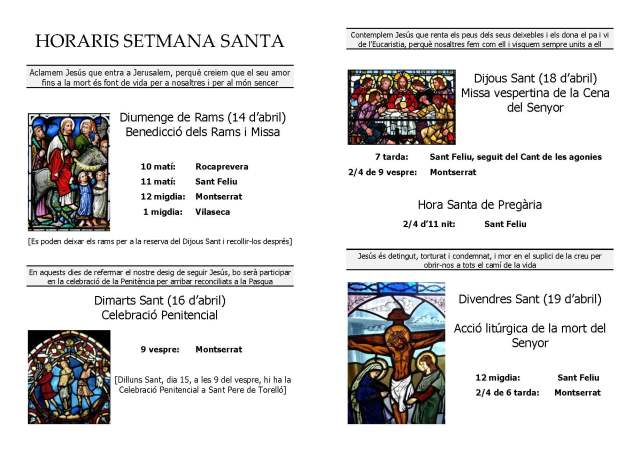 Aquí teniu els horaris de les celebracions de la Setmana Santa en pdf perquè us el pugueu descarregar, en imatge, i en format de text.