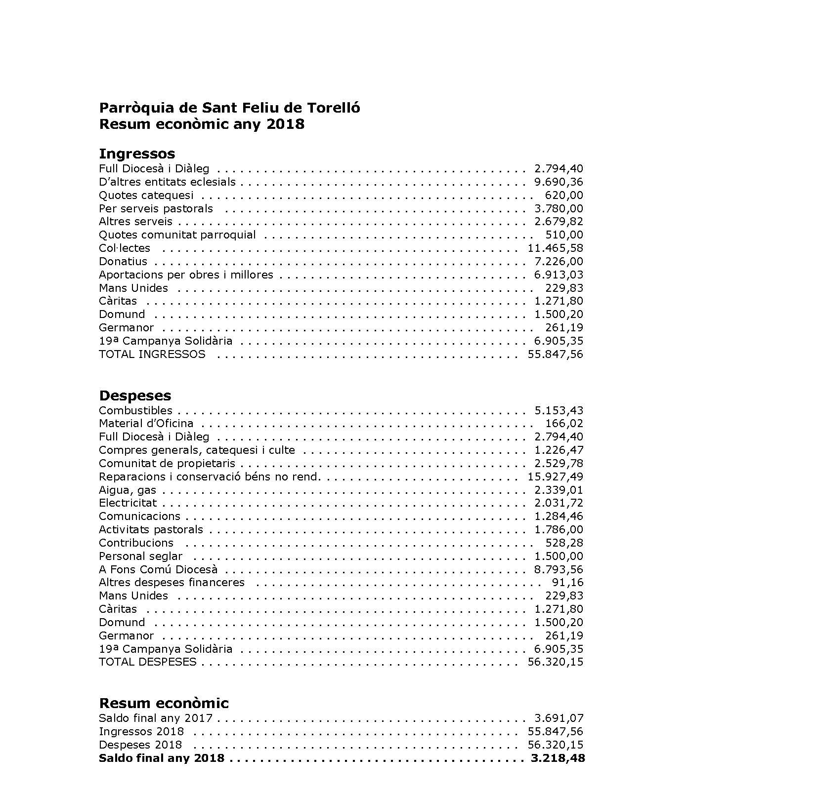 Aquest és l’estat de comptes de la parròquia de Sant Feliu de Torelló a 31 de desembre de 2018.