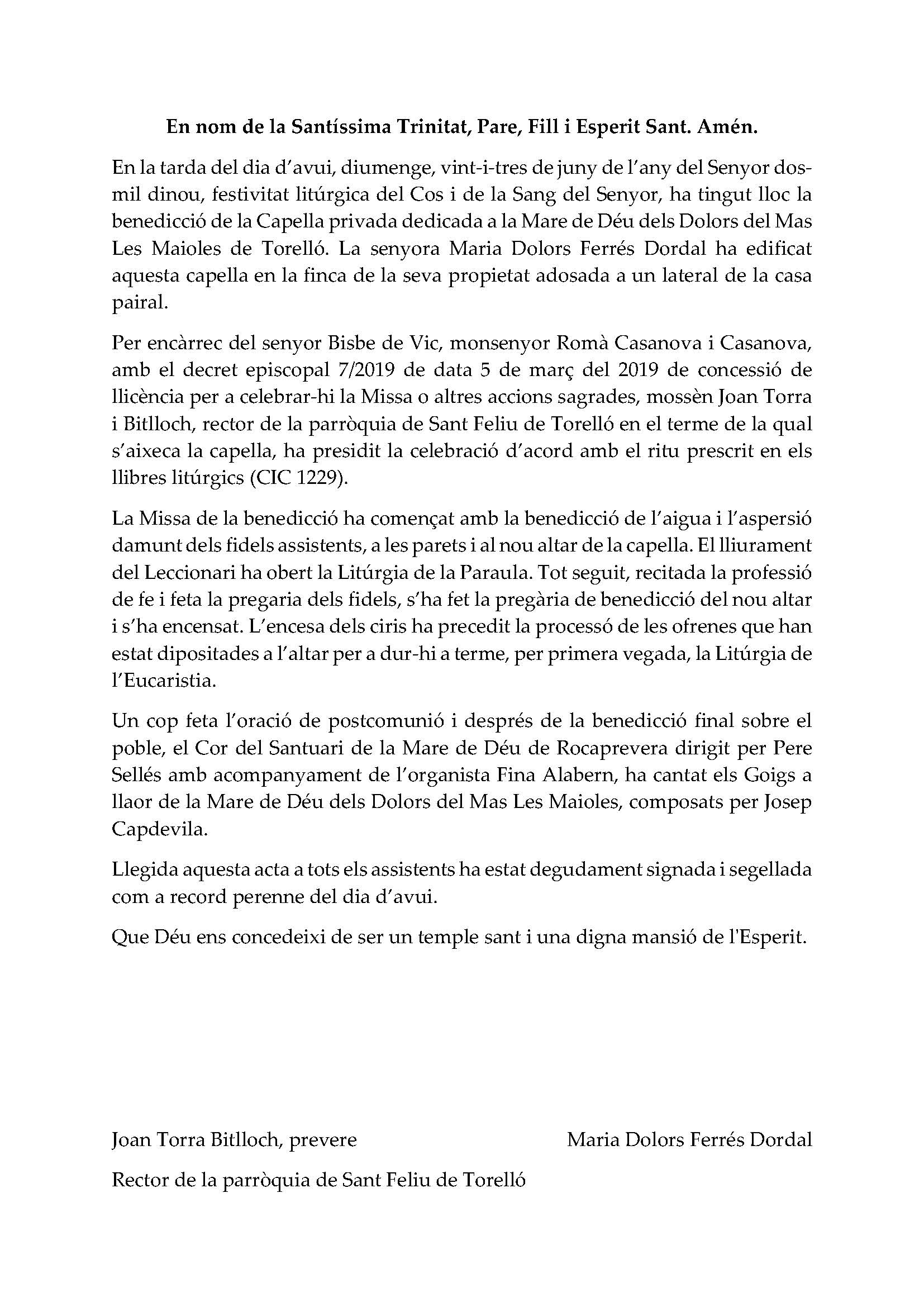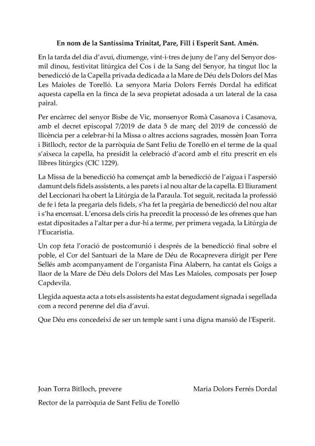 El diumenge, dia 23 de juny de 2019, ha tingut lloc la benedicció de la Capella privada dedicada a la Mare de Déu dels Dolors del Mas Les Maioles de Torelló.
