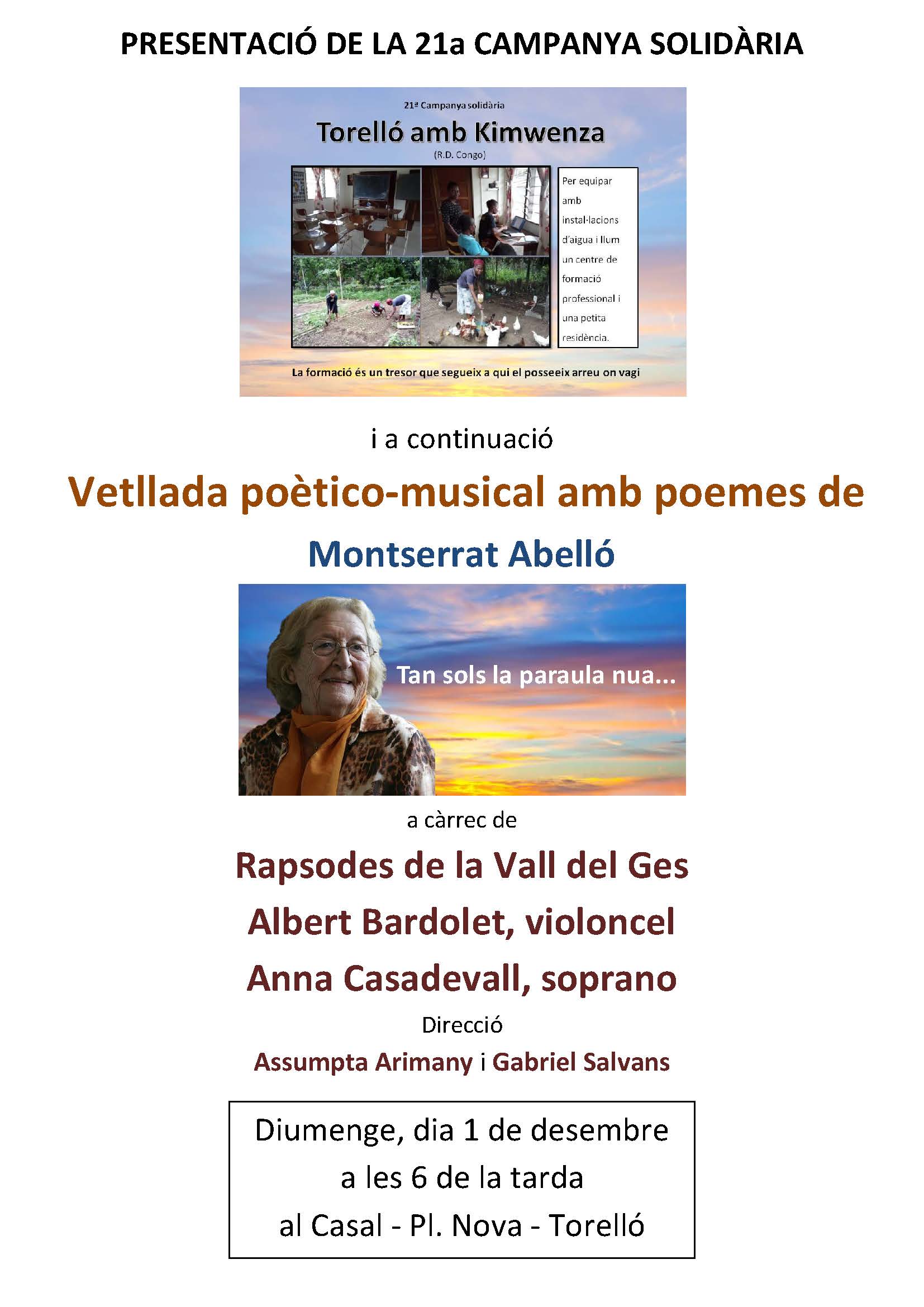 Fou el diumenge, dia 1 de desembre de 2019, al teatre del Casal de Sant Feliu de la Plaça Nova, a les 6 de la tarda. Es tractava de que els Rapsodes de la Vall del Ges amb direcció d’Assumpta Arimany i Gabriel Salvans, acompanyats per la música al violoncel d’Albert Bardolet i Anna Casadevall, soprano, fessin una lectura dels poemes de Montserrat Abelló.