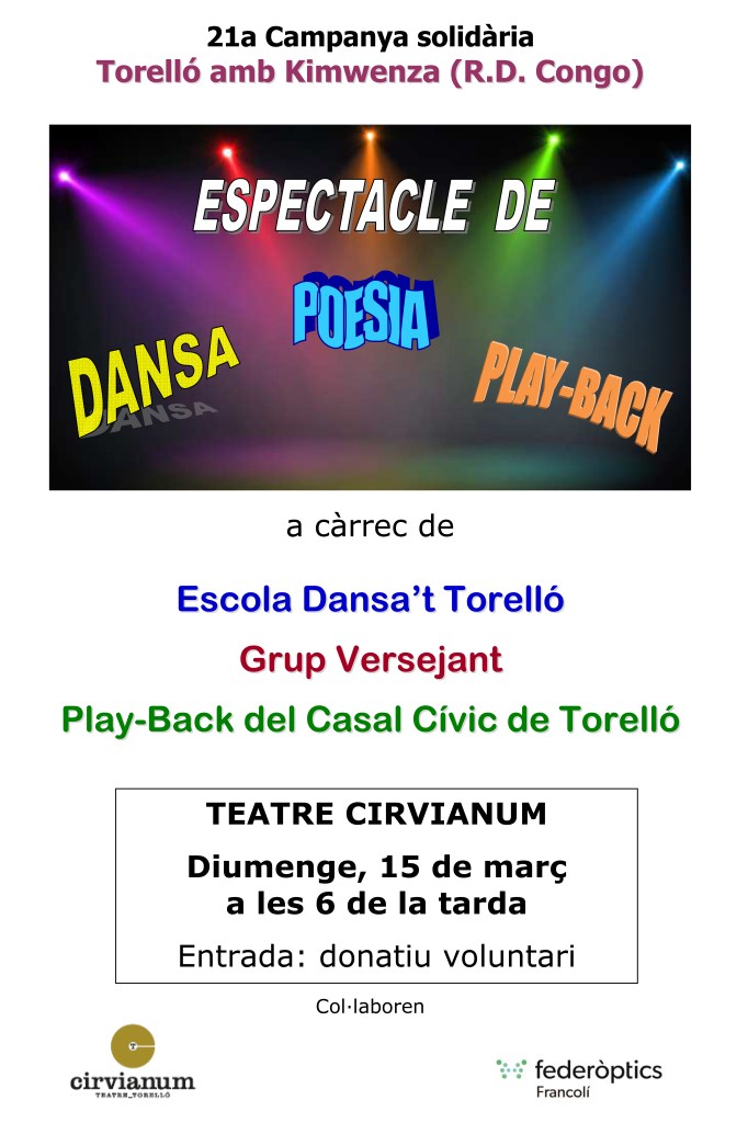 Aquest diumenge 15 de març, a les 6 de la tarda, tindrà lloc l’Espectacle de dansa, poesia i play-back a favor de la 21a Campanya Solidària Torelló amb Kimwenza (RD Congo), a càrrec de l’Escola Dansa’t Torelló, del grup Versejant i del grup de Play-back del Casal Cívic de Torelló.