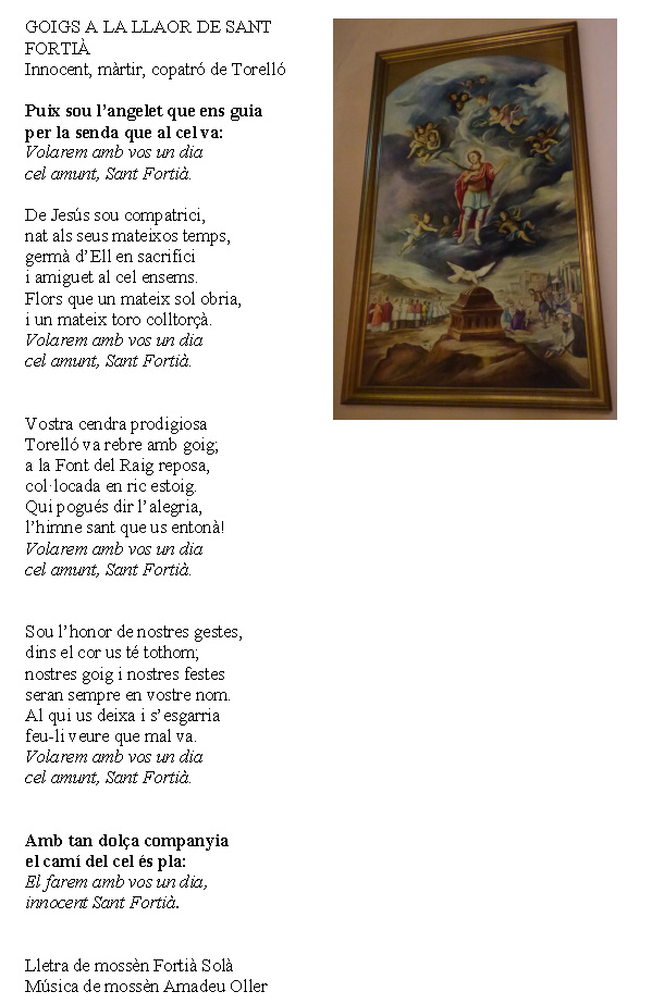 Aquest diumenge, 7 de novembre, és sant Fortià, copatró de Torelló. Aquest és un fragment dels goigs amb la imatge del quadre dedicat al sant que hi ha a l’església de Sant Feliu.