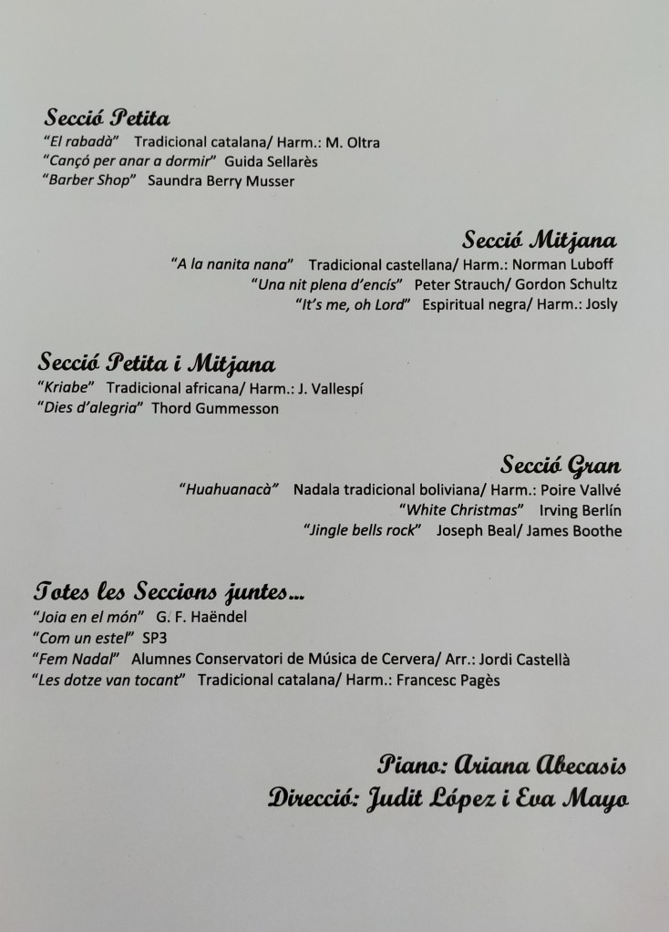 La coral va presentar un repertori de cançons “que hem preparat el els darrers dos mesos, i tenint en compte que hem estat mig any sense poder assajar, ha estat com una marató de fons”. Amb tot, les tres seccions van interpretar quinze cançons, sota la direcció d’Eva Mayo i Judit López i acompanyades al piano per Ariana Abecasis. Va ser un concert entranyable!. Cal felicitar-los i agrair-los que ho volguessin fer. En deixem testimoni gràfic.