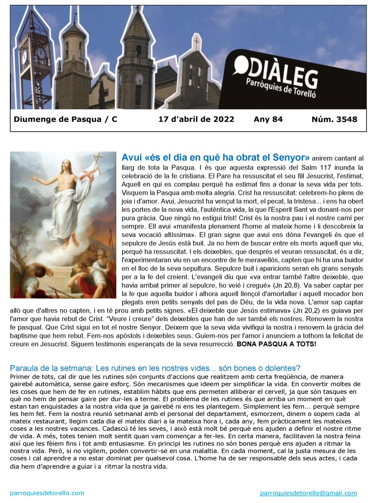 Aquest és el Diàleg del diumenge, dia 17 d’abril de 2022, en imatge i en format pdf per si us el voleu descarregar.
