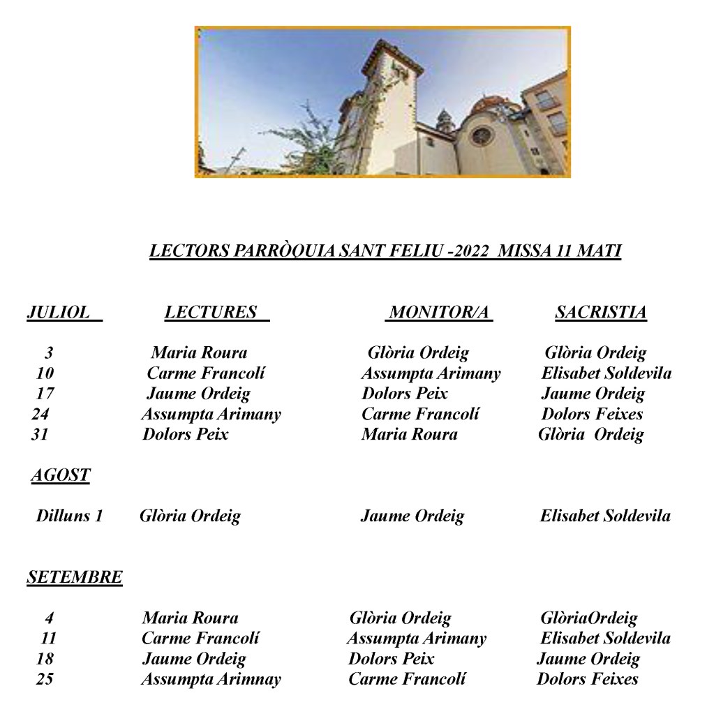 Aquesta és la distribució del servei de lectors, monitors i servei de sagristia de la missa de 11 del matí dels diumenges a la parròquia de Sant Feliu, dels mesos de juliol, agost i setembre de 2022.