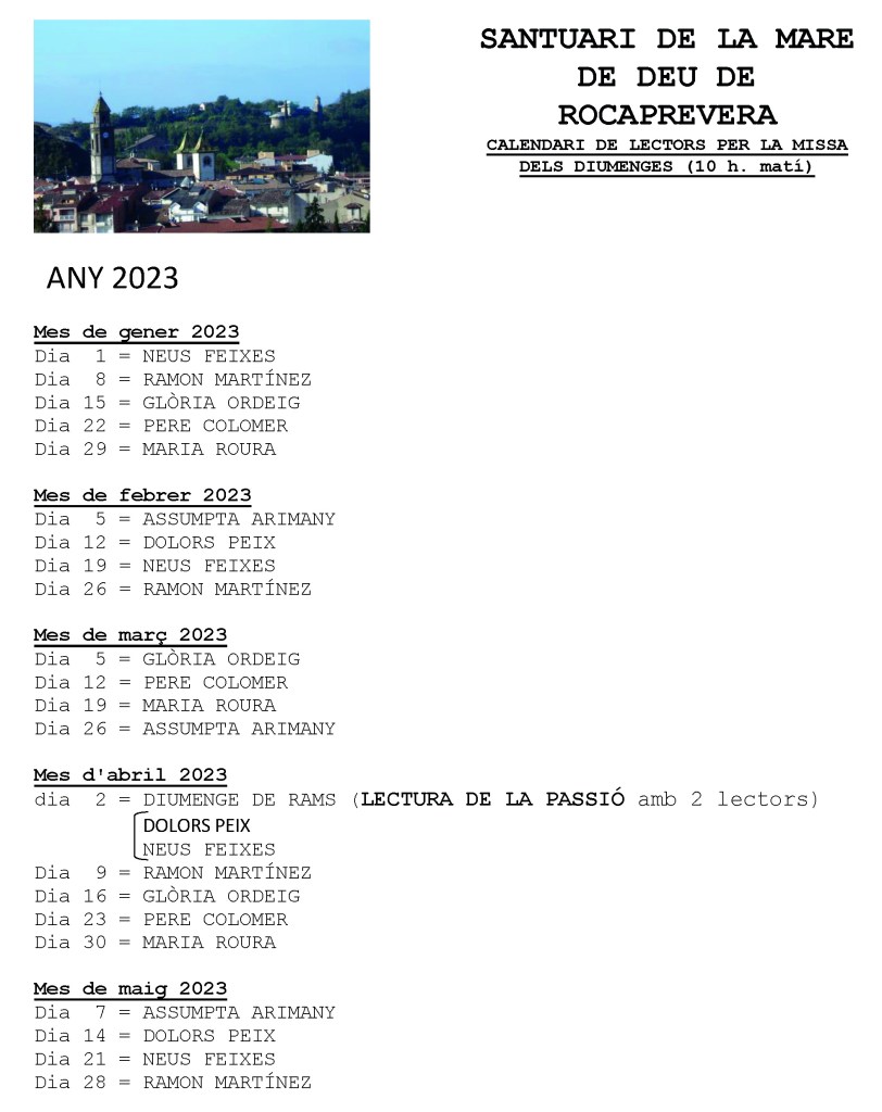 Aquesta és la distribució del servei de lectors de la missa de les 10 del matí dels diumenges al santuari de Rocaprevera, del mesos de gener a maig de 2023