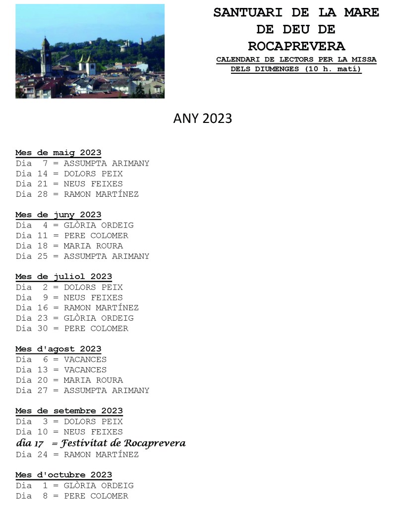 Aquesta és la distribució del servei de lectors de la missa de les 10 del matí dels diumenges al santuari de Rocaprevera, del mesos de maig a octubre de 2023