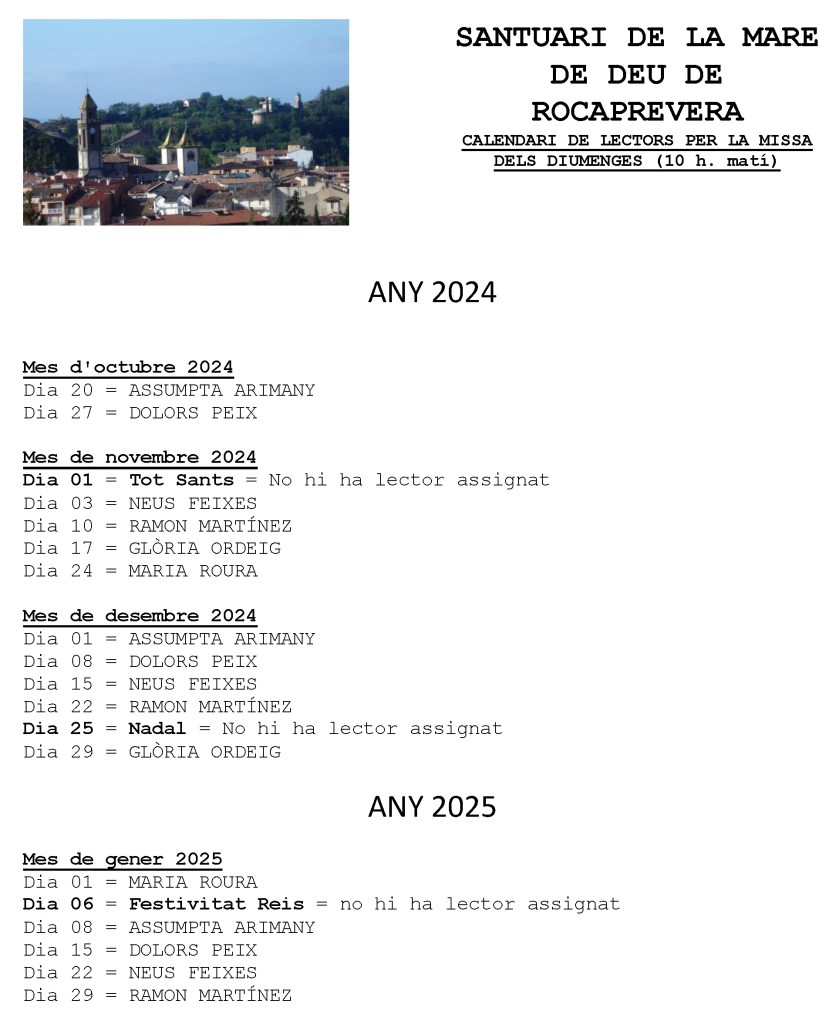 Aquesta és la distribució del servei de lectors de la missa de les 10 del matí dels diumenges al santuari de Rocaprevera, del mesos d’octubre de 2024 a gener de 2025