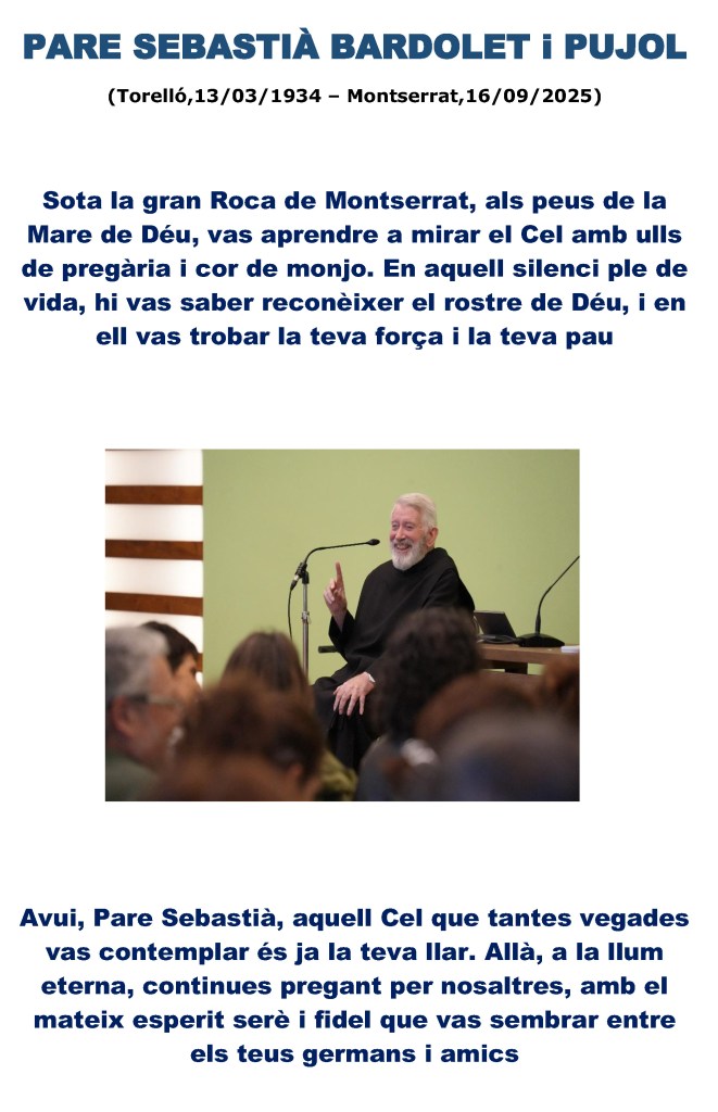 Les parròquies de Torelló van celebrar diumenge una missa en record del pare Sebastià Bardolet, abat emèrit del monestir de Montserrat que va morir el passat 16 de setembre. A la missa, que es va celebrar a l’església de Sant Feliu i van concelebrar mossèn Jean Claude Ruzinda, rector de les parròquies de Torelló, i el pare Jordi Castanyer, monjo de Montserrat , hi van participar els cors de Rocaprevera i de Montserrat, així com també alguns dels músics de la família Bardolet.