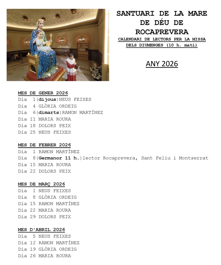 Aquesta és la distribució del servei de lectors de la missa de les 10 del matí dels diumenges al santuari de Rocaprevera, del mesos de gener a abril de 2026