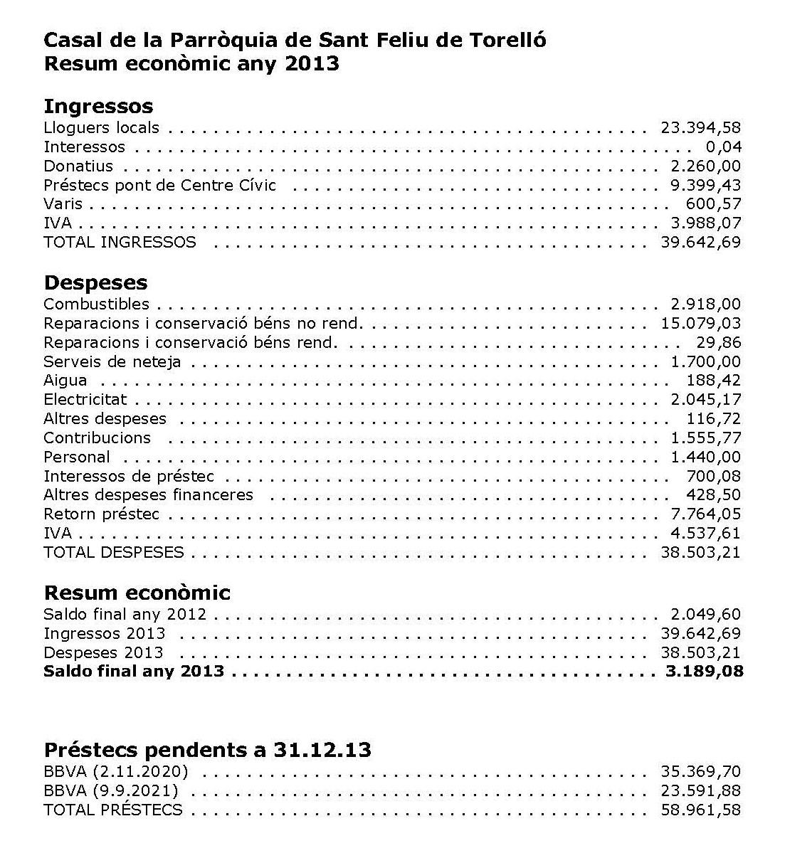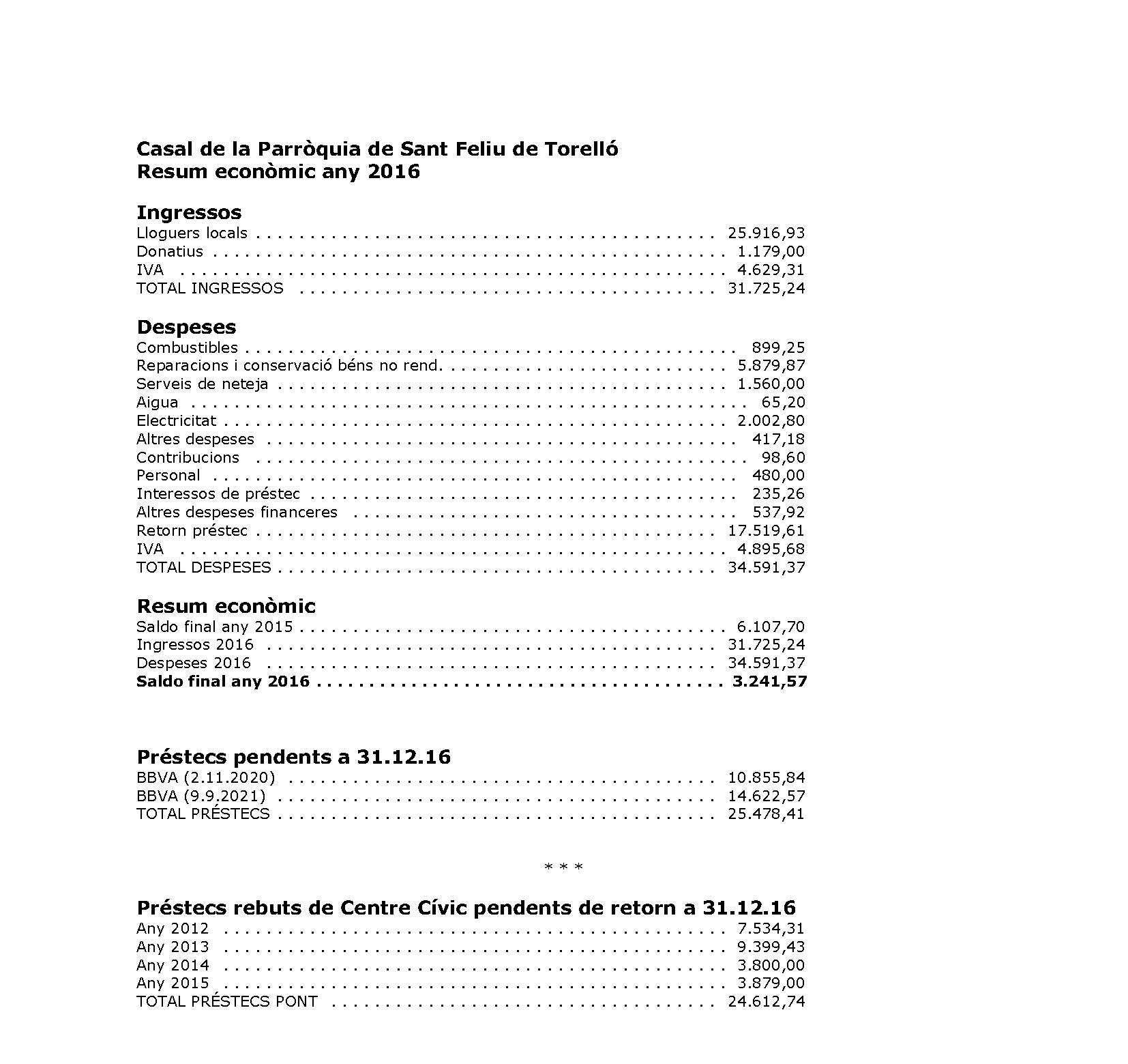 Aquest és l’estat de comptes del Casal de Sant Feliu de Torelló a 31 de desembre de 2016.