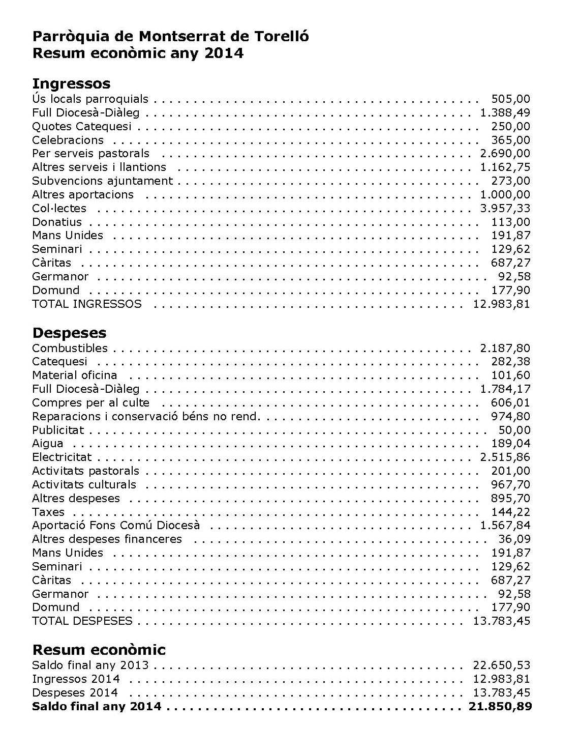 Aquest és l’estat de comptes de la parròquia de Montserrat de Torelló a 31 de desembre de 2014.