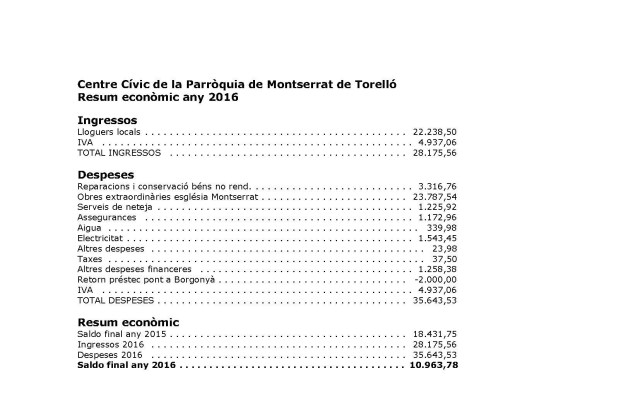 Aquest és l’estat de comptes del Centre Cívic de la parròquia de Montserrat a 31 de desembre de 2016.