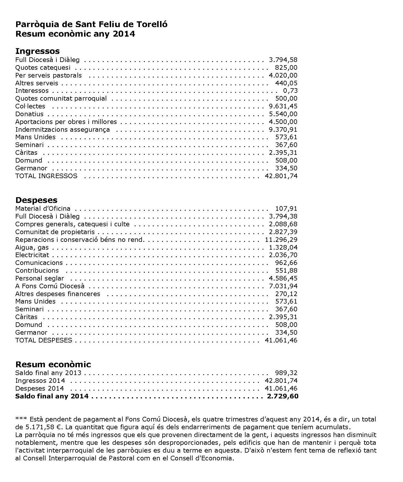 Aquest és l’estat de comptes de la parròquia de Sant Feliu de Torelló a 31 de desembre de 2014.
