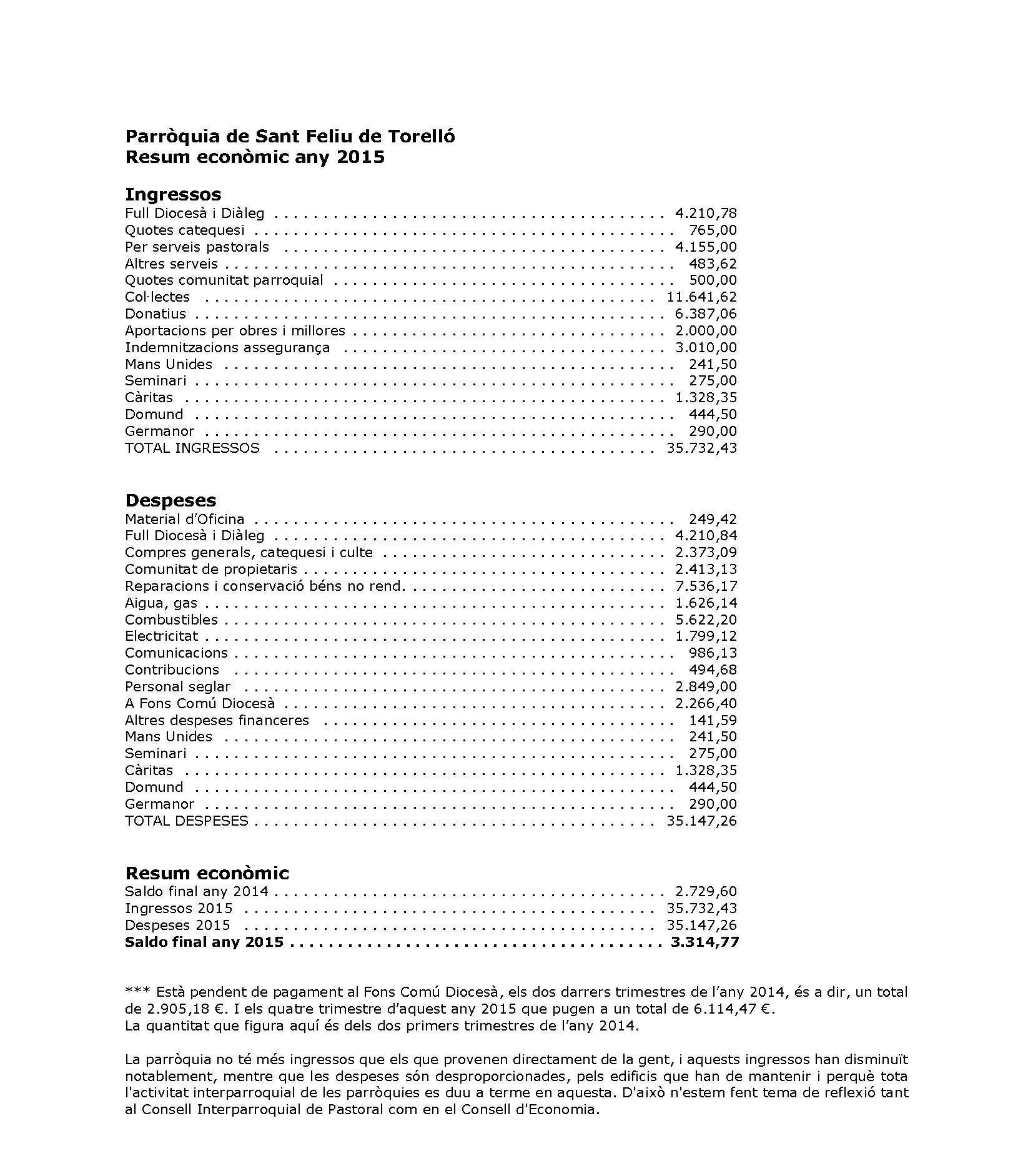 Aquest és l’estat de comptes de la parròquia de Sant Feliu de Torelló a 31 de desembre de 2015.