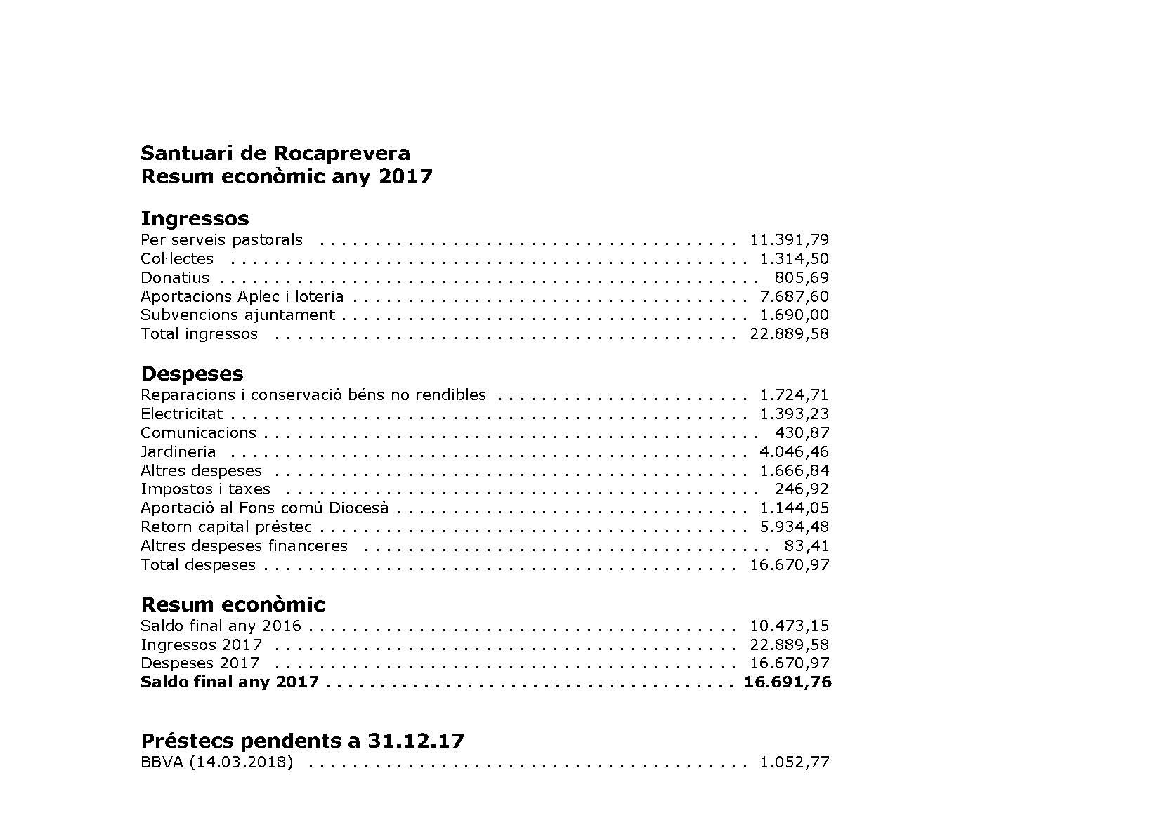 tes del Santuari de Rocaprevera a 31 de desembre de 2017.