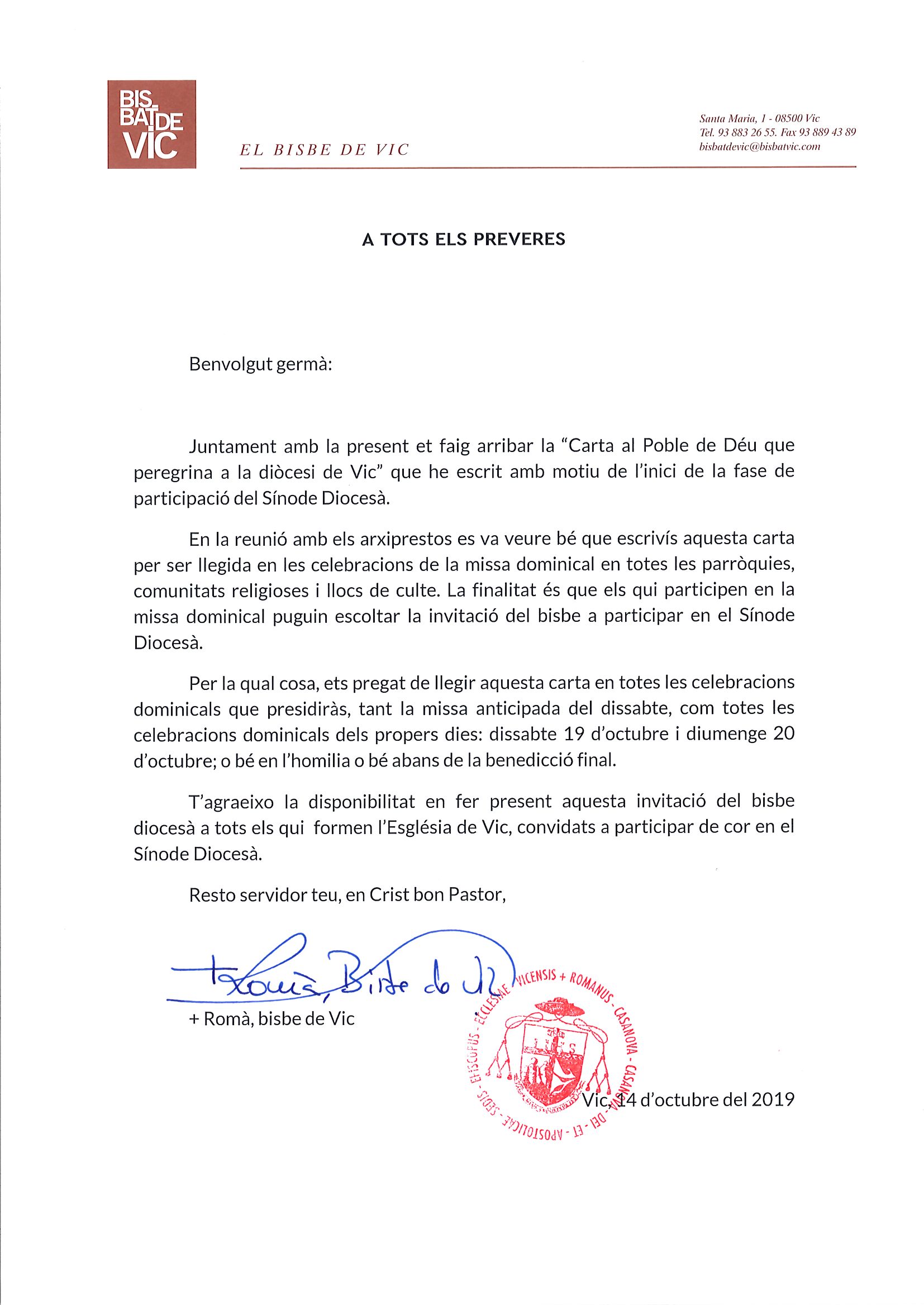 El senyor Bisbe de Vic, Mons. Romà Casanova i Casanova, ha demanat a tots els preveres que en les misses es llegeixi la carta “A tot el poble de Déu que pelegrina a la diòcesi de Vic” convocant i convidant al Sínode diocesà que en el nostre arxiprestat del Ter-Collsacabra es presenta el dissabte dia 26 d’octubre, a Manlleu; la carta, a més, queda penjada a tots els nostres temples. És aquesta que posem en enllaç pdf i en imatge.