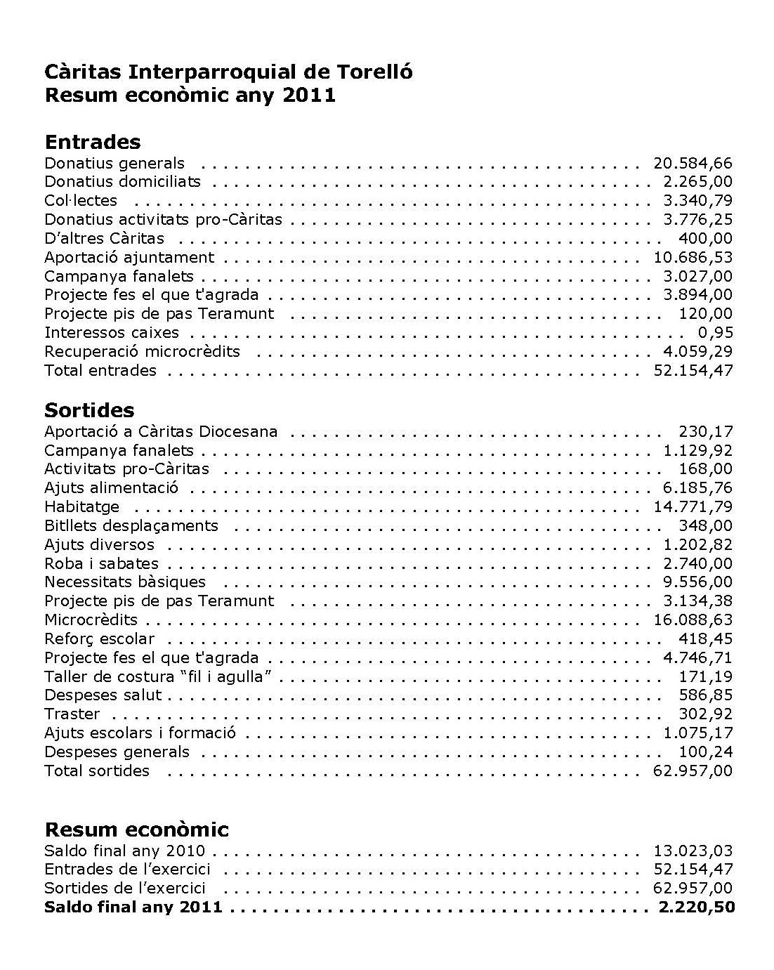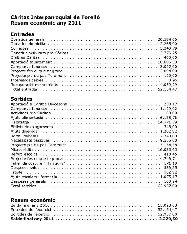 Aquest és l’estat de comptes de Càritas Interparroquial a 31 de desembre de 2011.